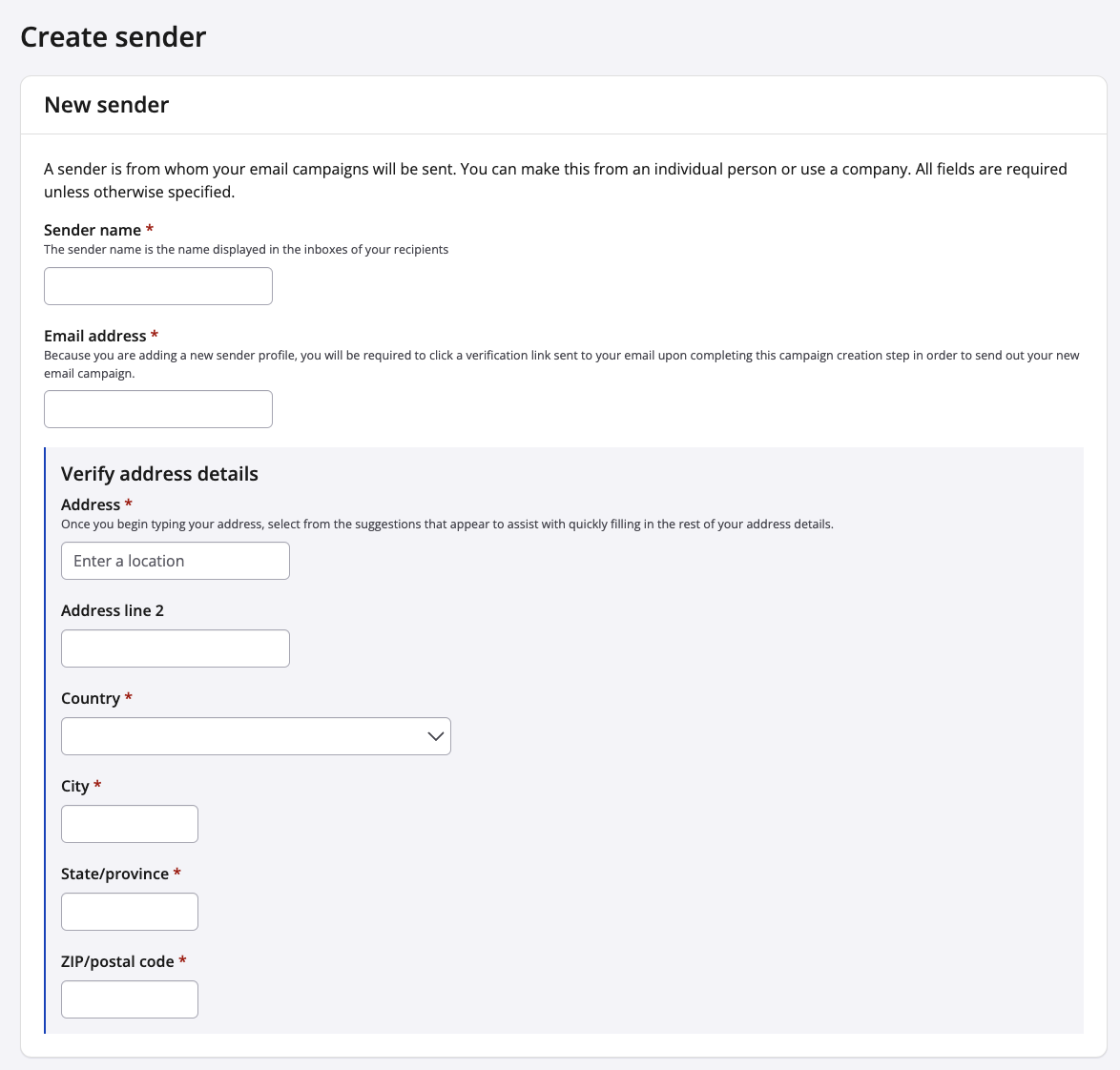 Creating a sender is an important part of setting up your campaign. After following through the steps below, you will receive a verification email that you must complete before being able to activate any campaigns.
