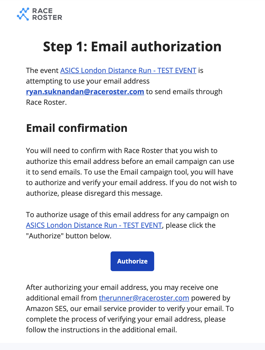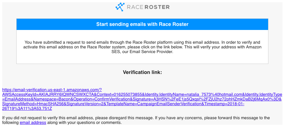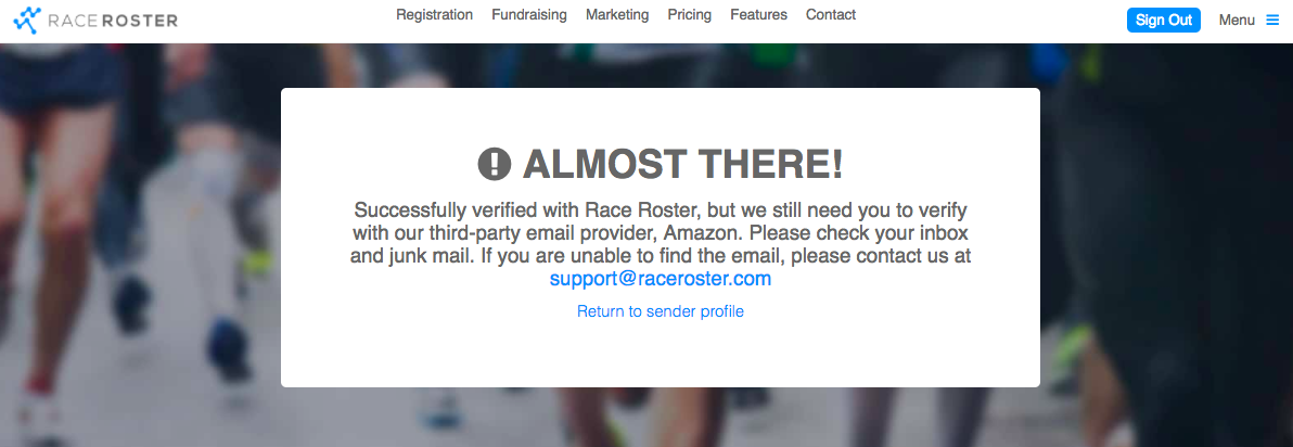 1. Once you add a sender you will receive 2 verification emails - one from Race Roster and one from our Amazon mail server