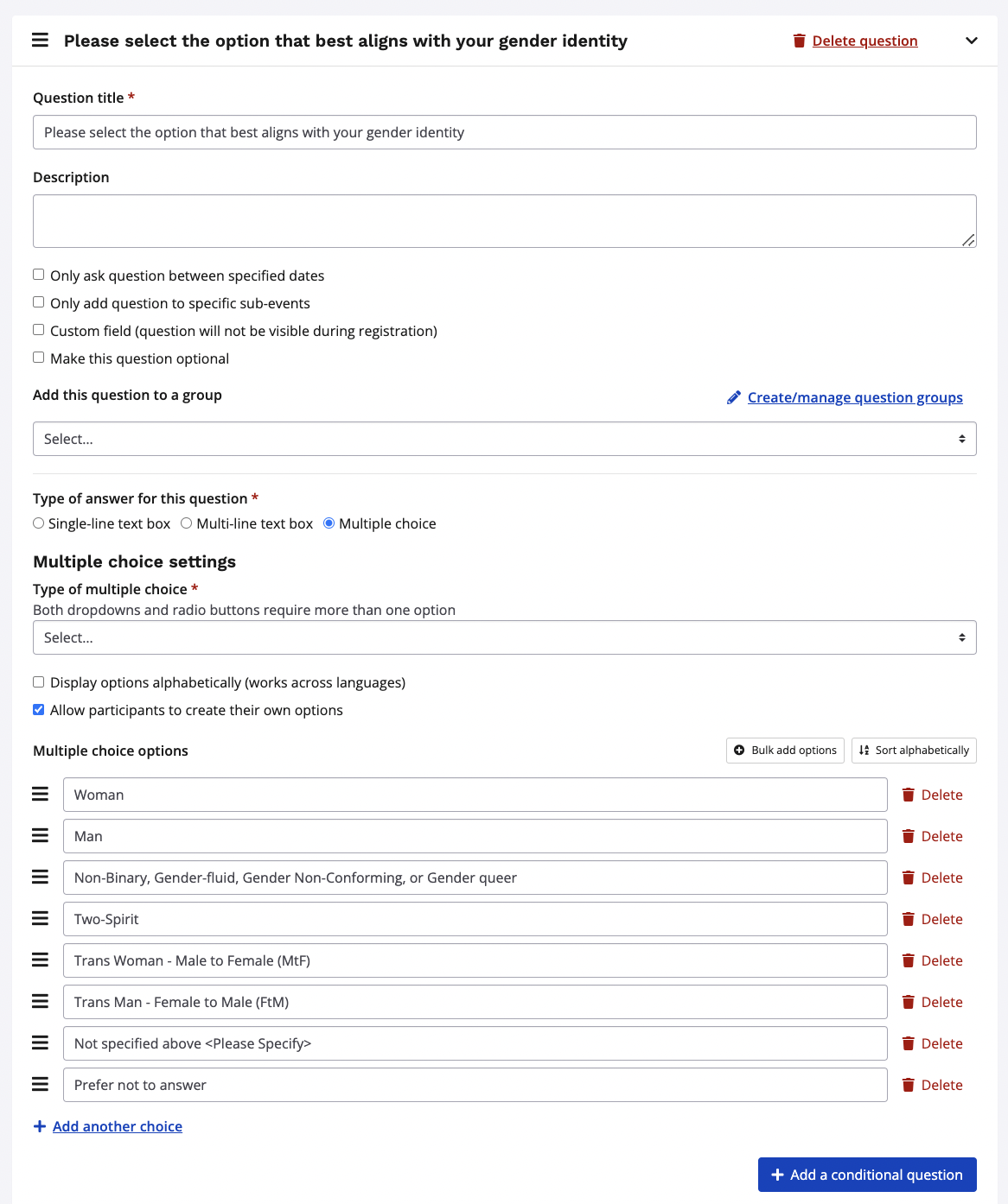Optional: By checking off the setting "Allow participants to create their own options", your participants can type in their own answer outside of the multiple choices if their gender identity does not align with any of the options provided.