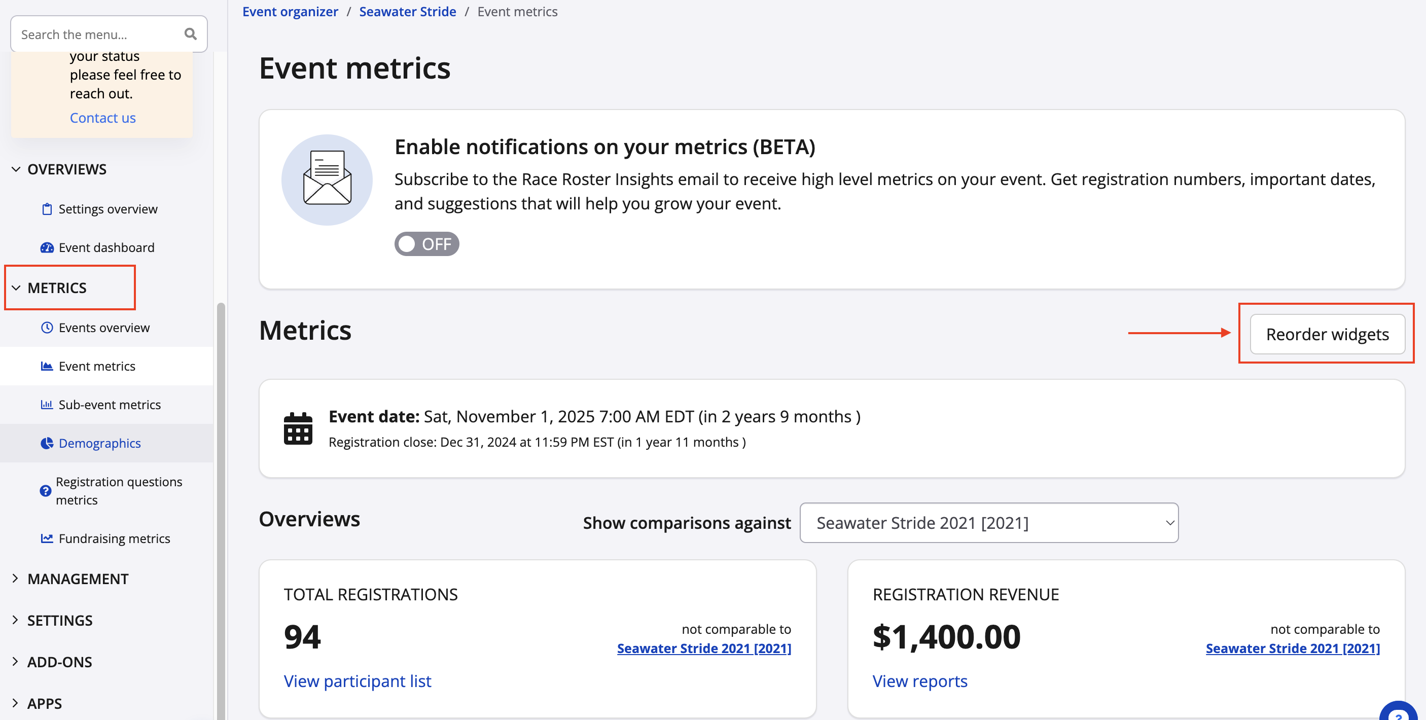 2. Navigate to the left and click the Metrics tab and click the metrics page you would like to customize: Event metrics, Sub-event metrics, or Demographics