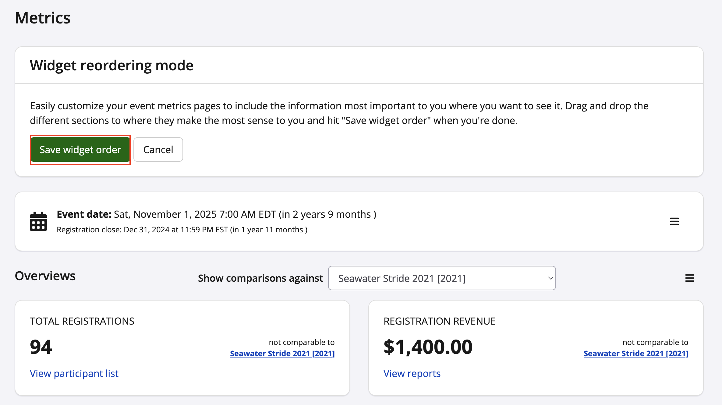 3. Click the Reorder widgets button on the top right hand side (visible on all metric pages)