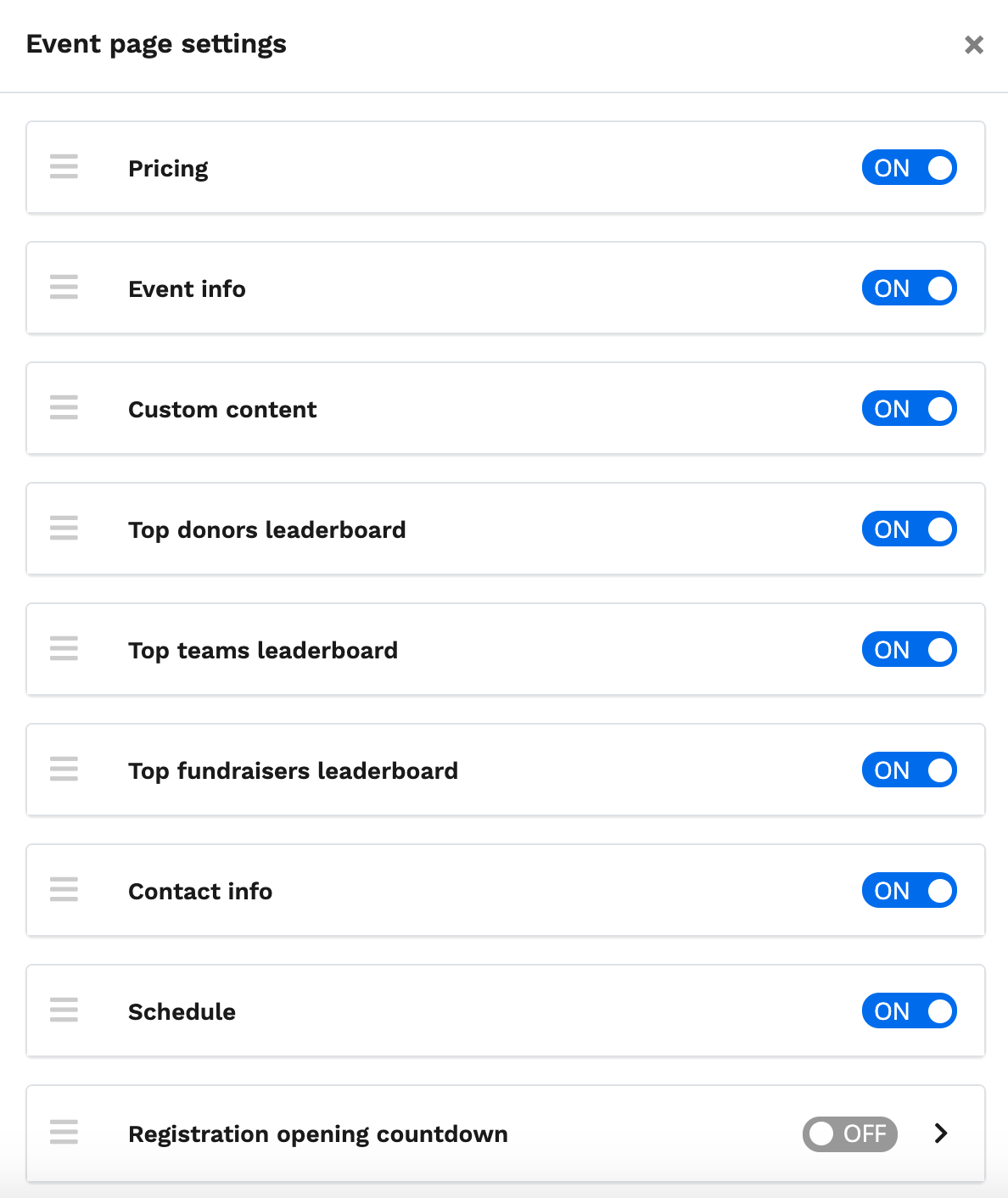 2. Click and drag the three-line action icon to move your tile. Moving your tile higher or lower will determine where your content will appear on your event details page.