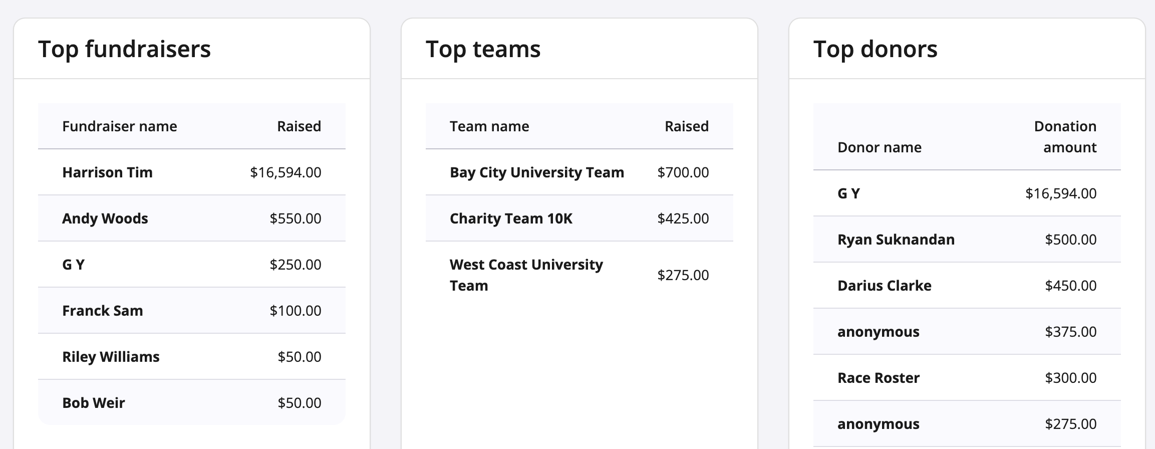 10. A section dedicated to providing a list of your top fundraisers, top teams, and top donors can also be accessed