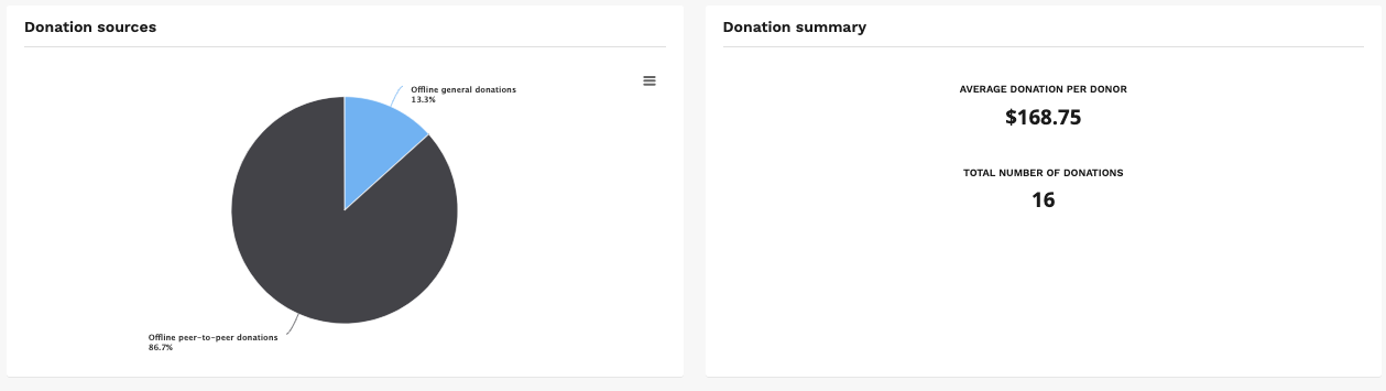 6. Donation sources will give a good overview of where donations are being being (e.g. offline peer-to-peer, offline general, team peer-to-peer, etc.) and donation summary will provide a average donation per donor and the total number of donations