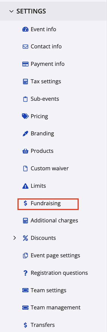 2. Navigate to the left of your screen and select Settings, followed by Fundraising from the drop down menu