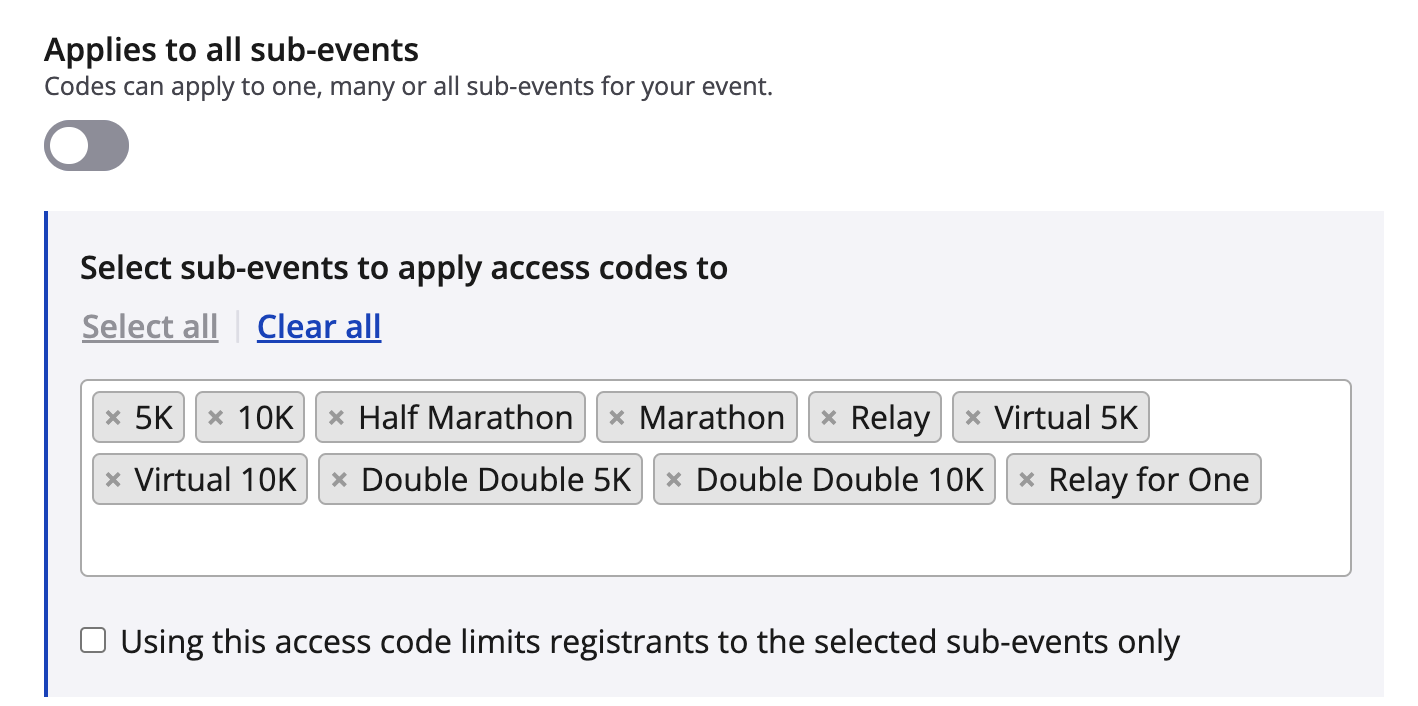 4. Next if you want the access code to only apply to specific events, deselect Applies to all sub events and using the x remove the sub-events that do not apply