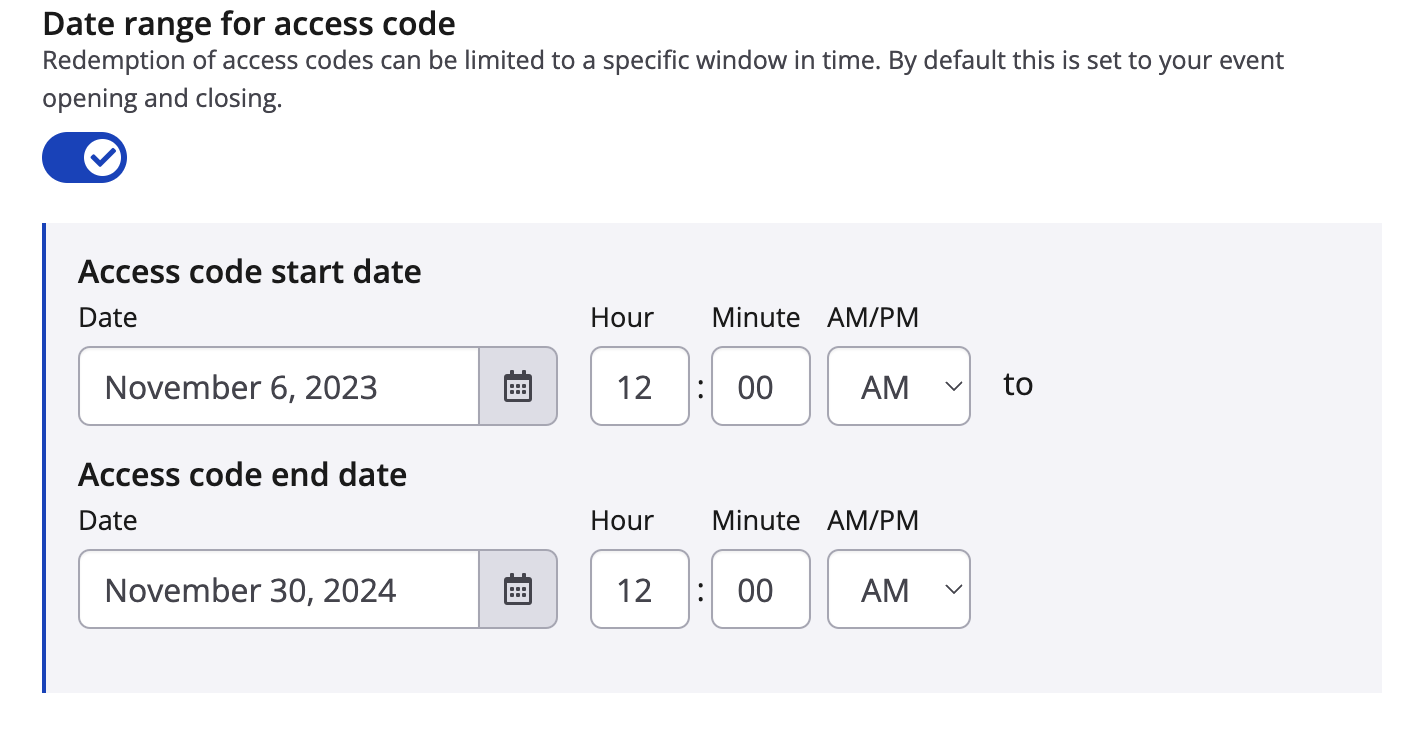 5. Now set the Time Window (optional) you would like this code to be valid for entry. By default this is set to your event open and close dates. Note: As this is an access code you CAN set these dates outside of the regular registration open and close dates, which is helpful when trying to register people pre or post event