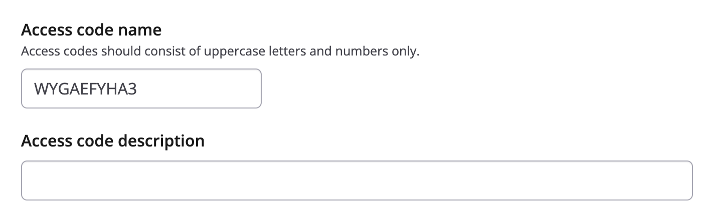 3. Enter the Access code name that you wish to distribute to your participants for e.g. EARLYBIRD19 OR you can use the code that was automatically generated for you *Access codes should consist of upper-case letters and numbers only*