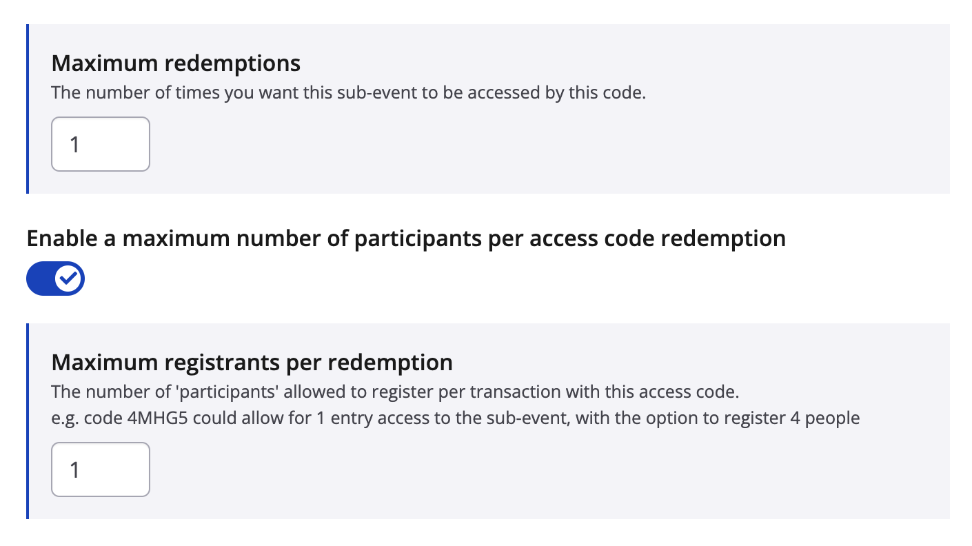 a) Check the box next to The # of times you want this sub-event to be accessed by this code and under Maximum Redemptions enter the number of times you want the code to be used to access the registration form for your selected sub-events e.g. if you wanted 50 people to be able to get to the registration page for the half marathon set the amount to 50 (limit # per transaction in point 9. b)