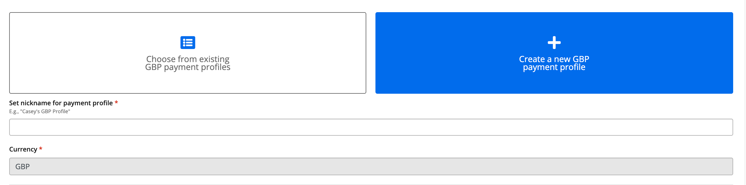 2. Click Create a new + GBP Payment Profile. (It will be pre-selected if you do not have any payment profiles created).