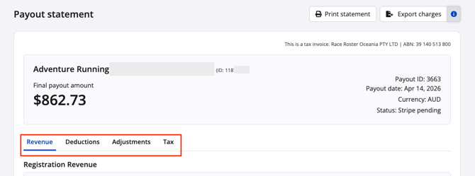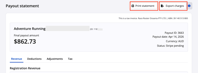 This will align with the payout statement. Race Roster has already combined the two for ease of use. Click Export charges in the top right corner of the payout statement for a detailed payout charges breakdown report of all charge and adjustment data.