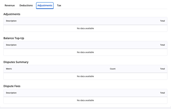 3) Adjustments: Balance top ups, disputes and dispute fees, manual credits or debits