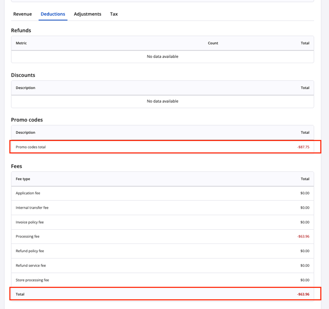 ie $862.73 (Payout) = $936 (Revenue) + -$87.75 (promo) + -$63.96 (fees) + $78.44 (tax)