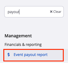 2. Navigate to the search box in the top left of the screen, search for and select Event payout report. Alternatively, go to Management > Financials & Reporting and select Event payout report from the drop-down menu.