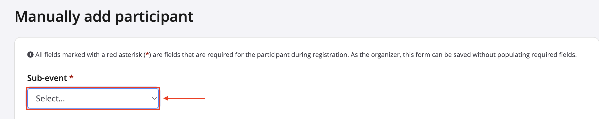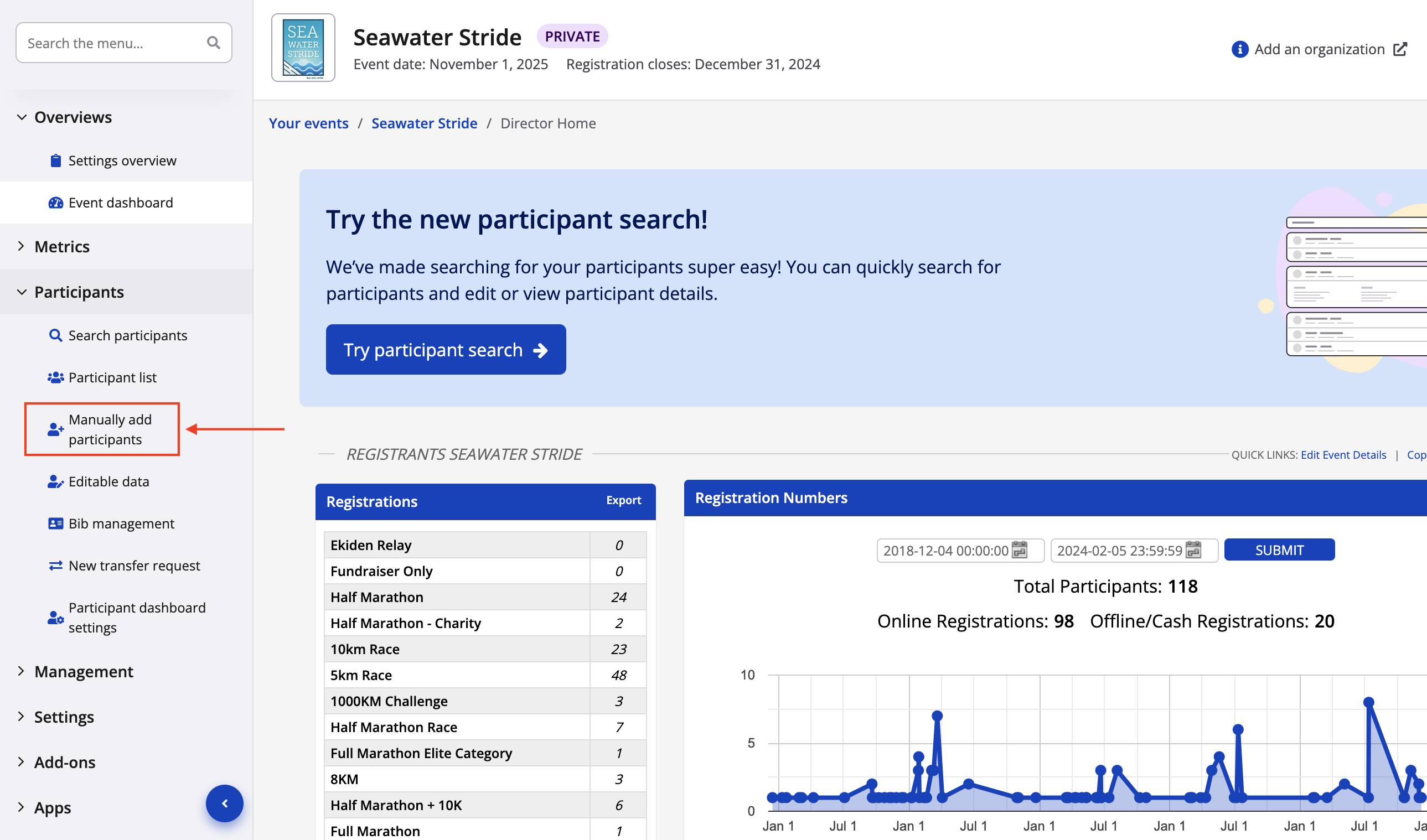 - From your event dashboard, click on Participant -> Manually add participant from the lefthand side menu.