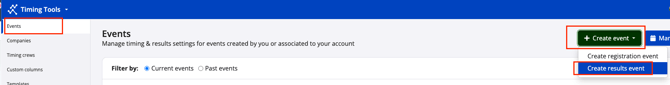 2. Ensure the Events tab is selected from the left hand sidebar. Click the green Create Event button, followed by Create results event.