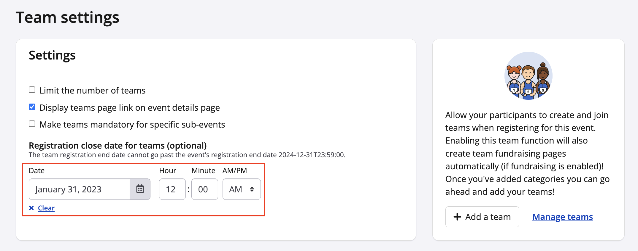 - Go to 'Set a registration close date for teams?' and use the calendar picker to set a date for team registration close (with this feature athletes will have to register as individuals after the team cut off date)