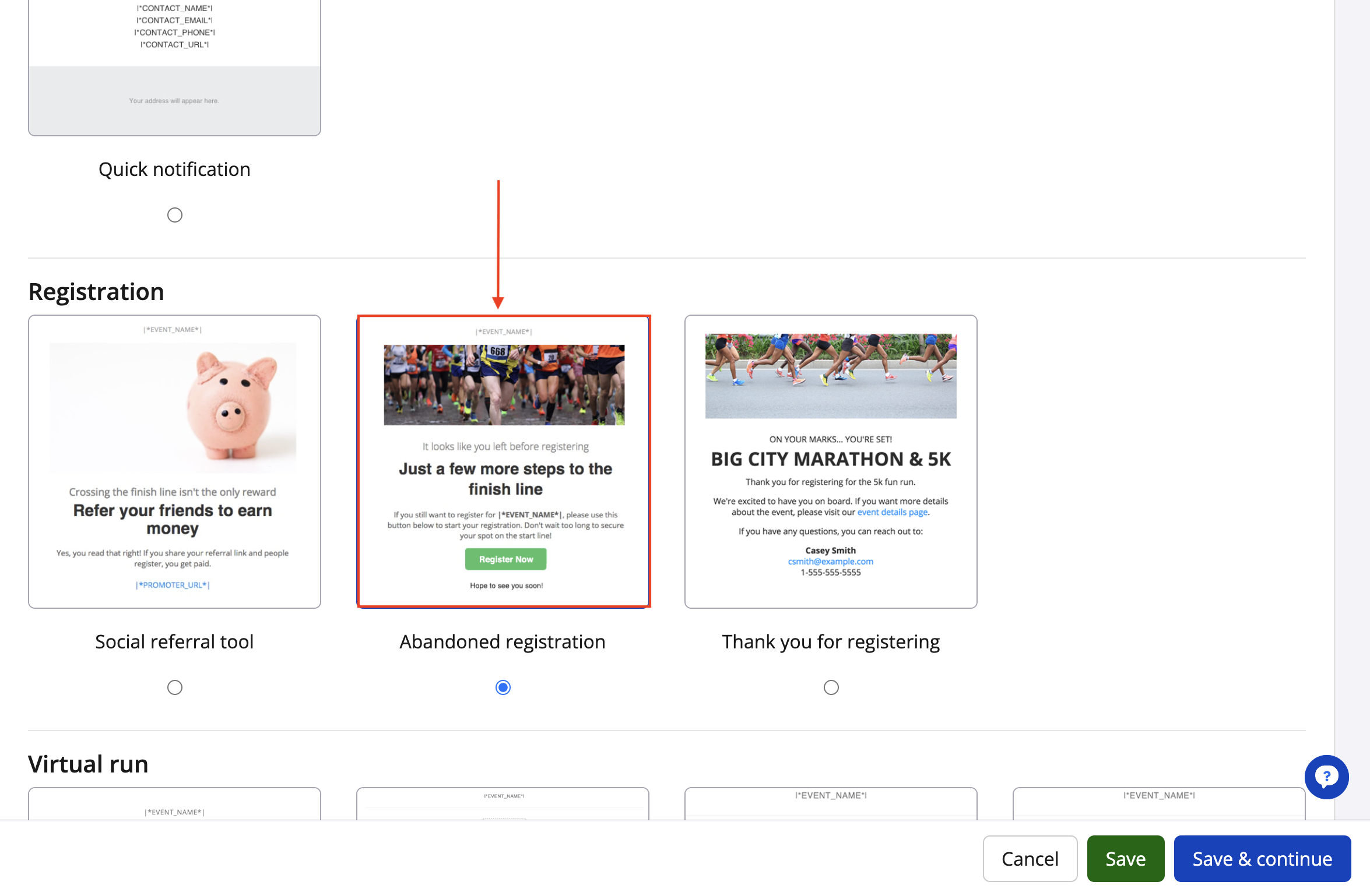 5. In Template (step 5), select the template of your choice. We recommend either designing your own template (blank) or selecting the "Abandoned registration" default template that includes specific language to encourage your incomplete registrants to return to the registration form. Click "Save & continue" once you've selected a template.