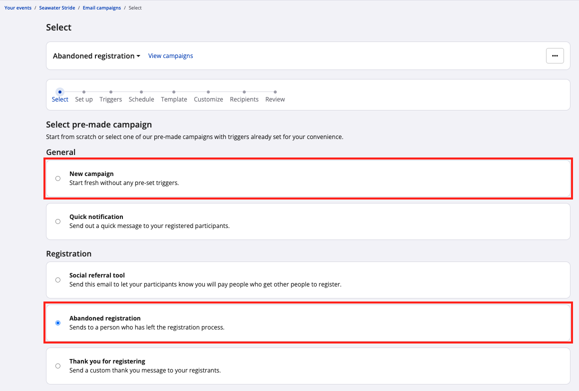 - Abandoned Registration: This option will pre-select the triggers in step 3 of creating your campaign, and will pre-select your campaign's design template within step 5.