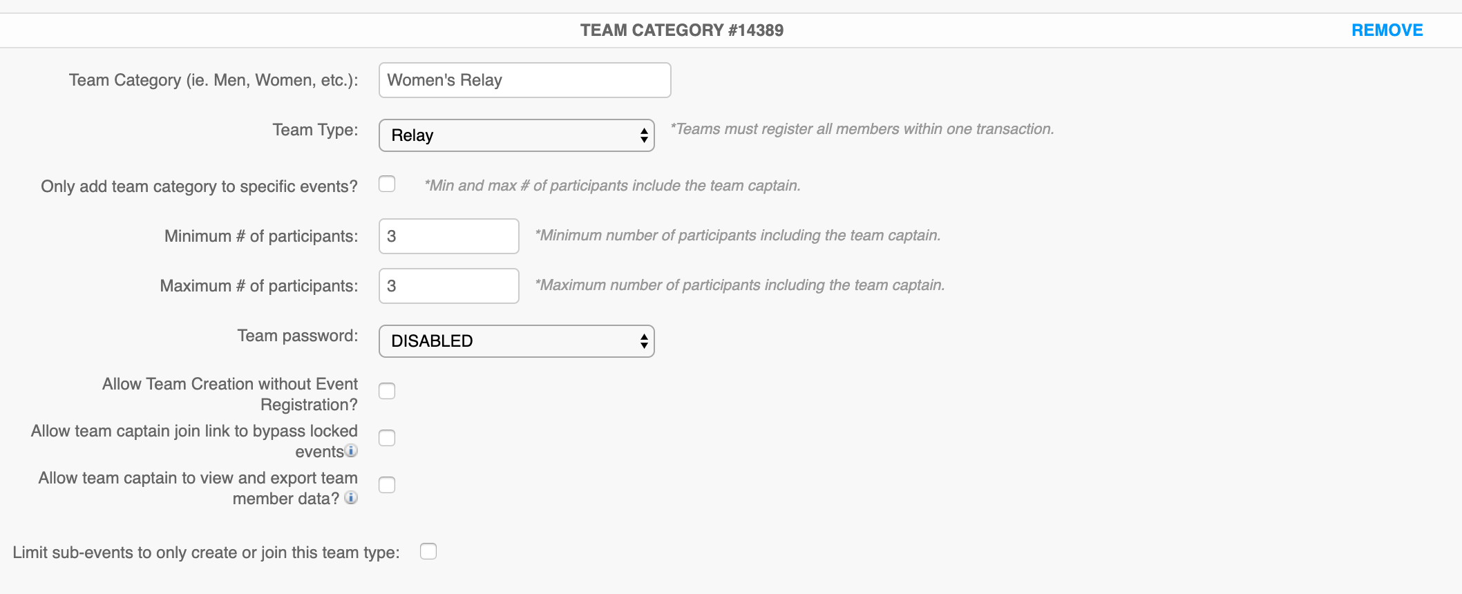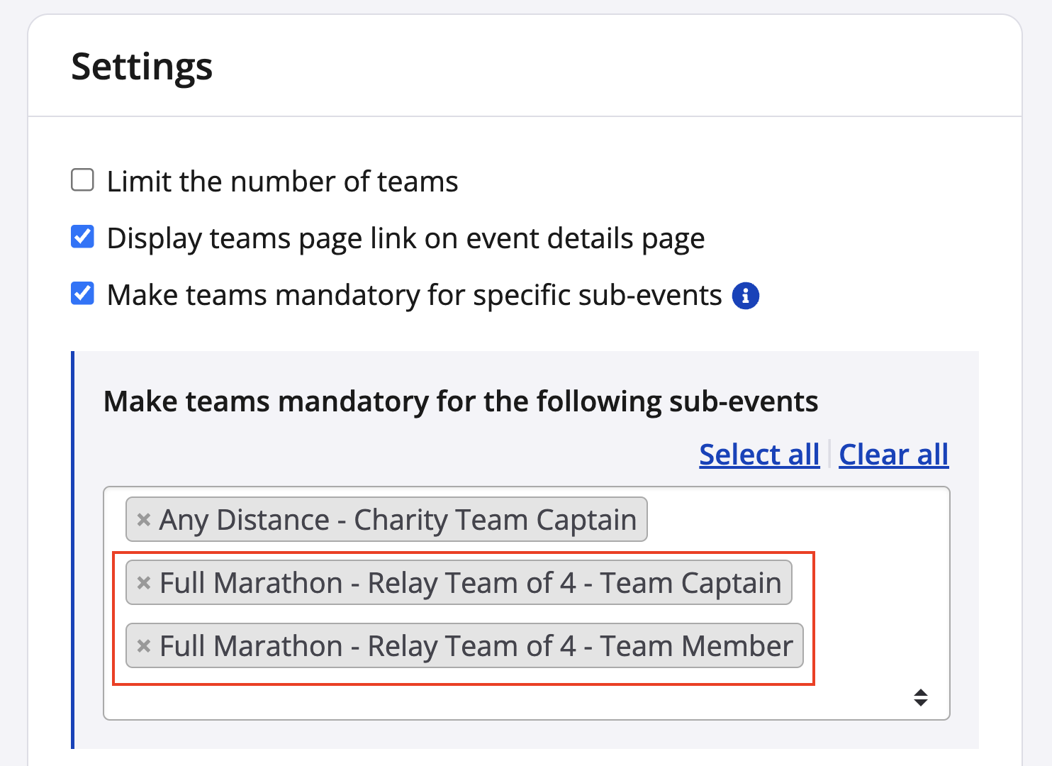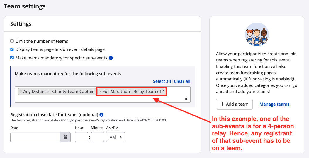 3. For each sub-event that requires team registrations (such as a team relay), make teams mandatory for that sub-event.