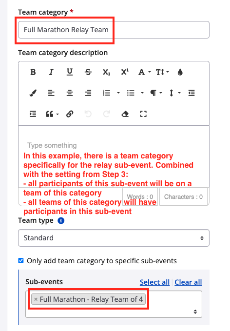 4. We recommend creating a team category corresponding to the relay sub-event. For the team type, you have two options: