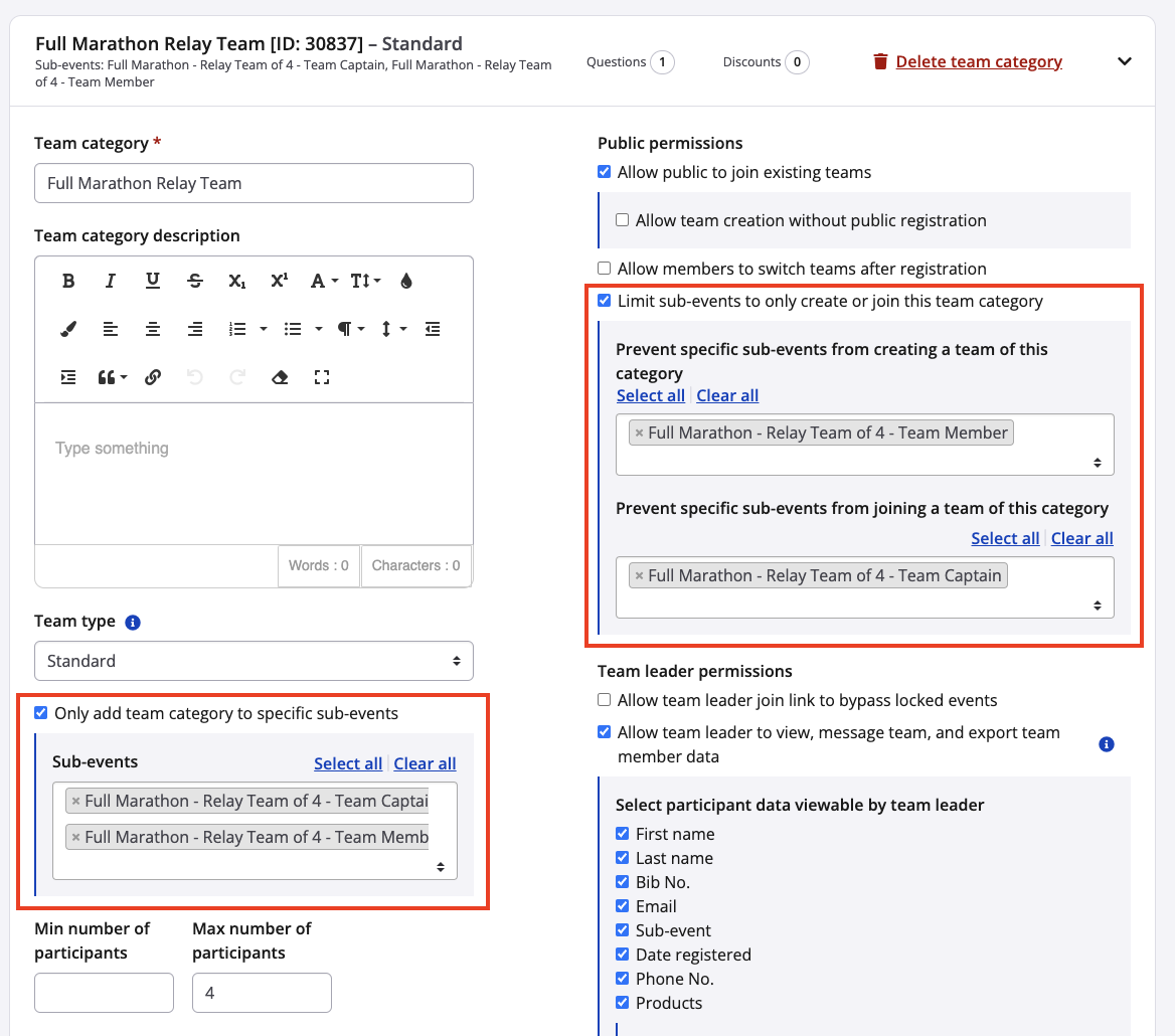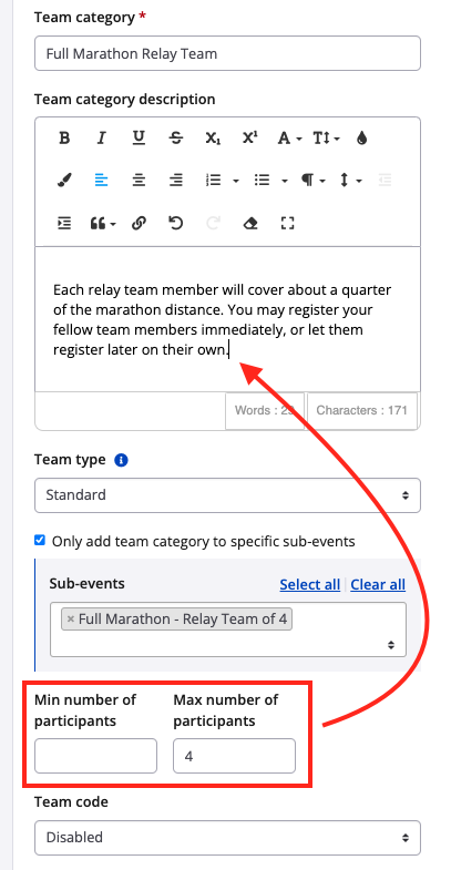 If you only want this team category to be eligible to specific sub-events, select from the box.