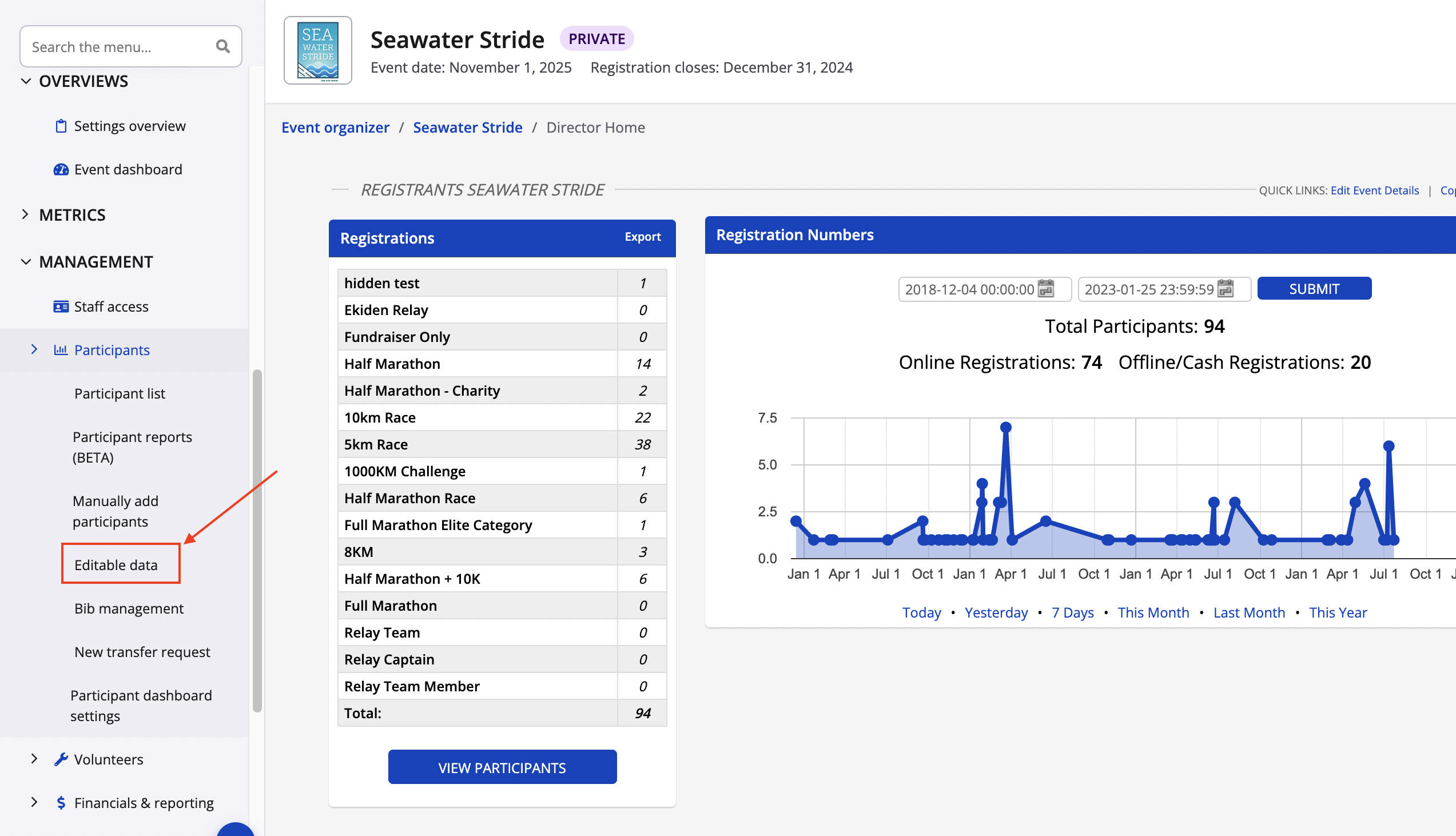 2. From your dashboard navigate to the left of your screen and select Management > Participants, followed by Editable Data from the drop-down menu
