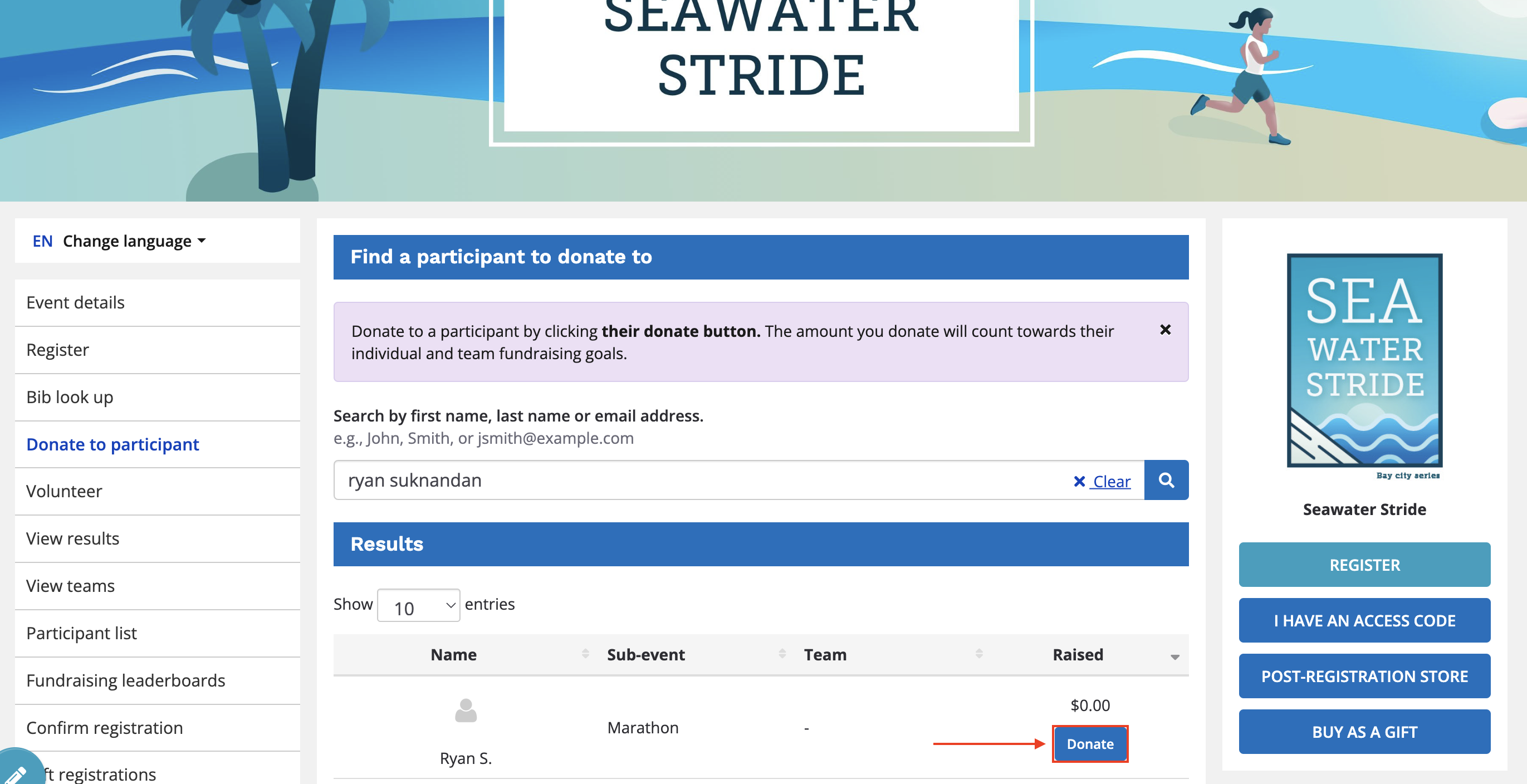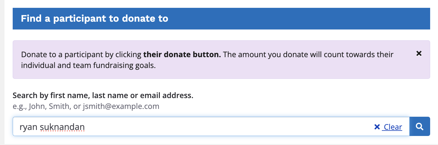 - Search for your pledge page by entering your first name OR last name OR email address in the search bar provided and hit the search icon
