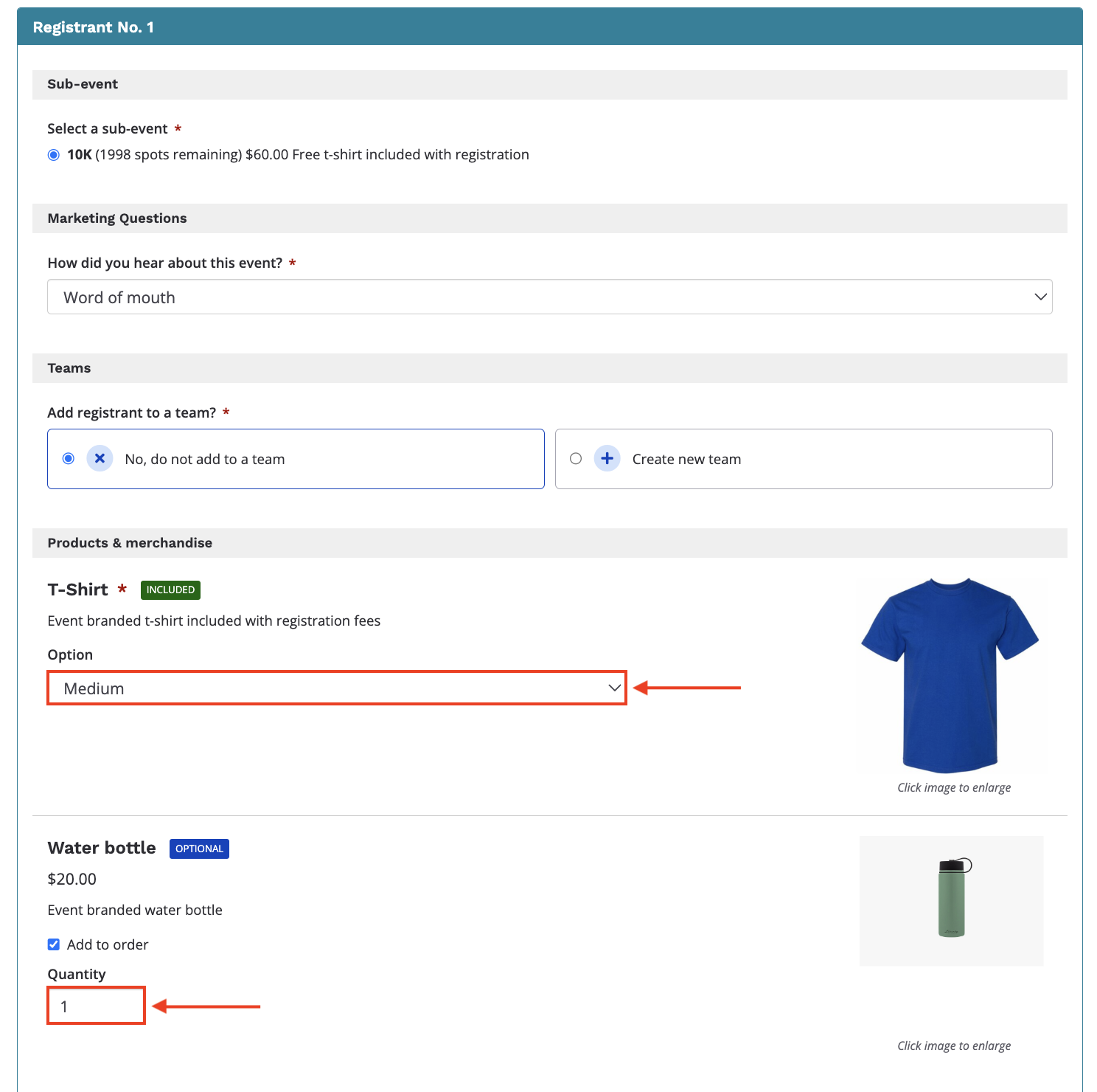 5. Once inside the transfer form, the applicable user will be prompted to complete their registration under the new sub-event/participant's name. In most cases when completing the new transfer, product purchases will automatically carry over to the new registration, and will be pre-selected if the settings are such that product credit applies to the new registration.