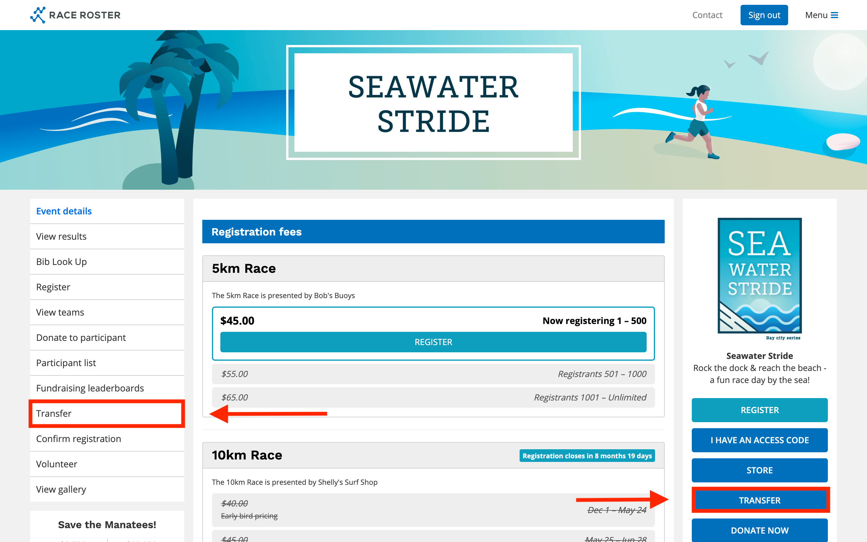 PLEASE NOTE: Not all events on Race Roster have automated transfer settings enabled. If you do not see any transfer buttons or links on the event registration page, please sign in to Race Roster. If you still cannot see anything after signing in, contact the event organizer and inquire about their transfer policies.