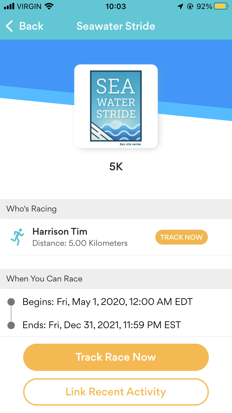 5. After you selected your desired race, you will be asked if you are ready to start your activity. Select link recent activity to submit an activity that you have completed on your Apple Watch, Garmin Watch, or Fitbit.