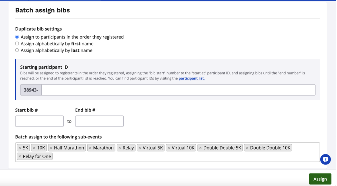7. Under the Batch Assign Bibs section enter your Bib range Start Number and Bib End Number.