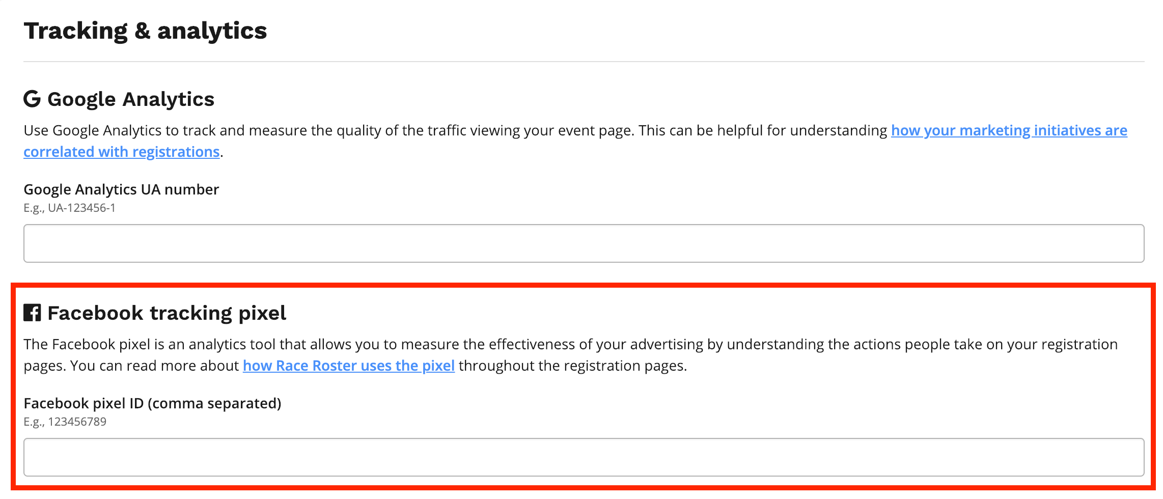 - Scroll down to the "Facebook Tracking Pixel" section and insert your Facebook pixel ID.