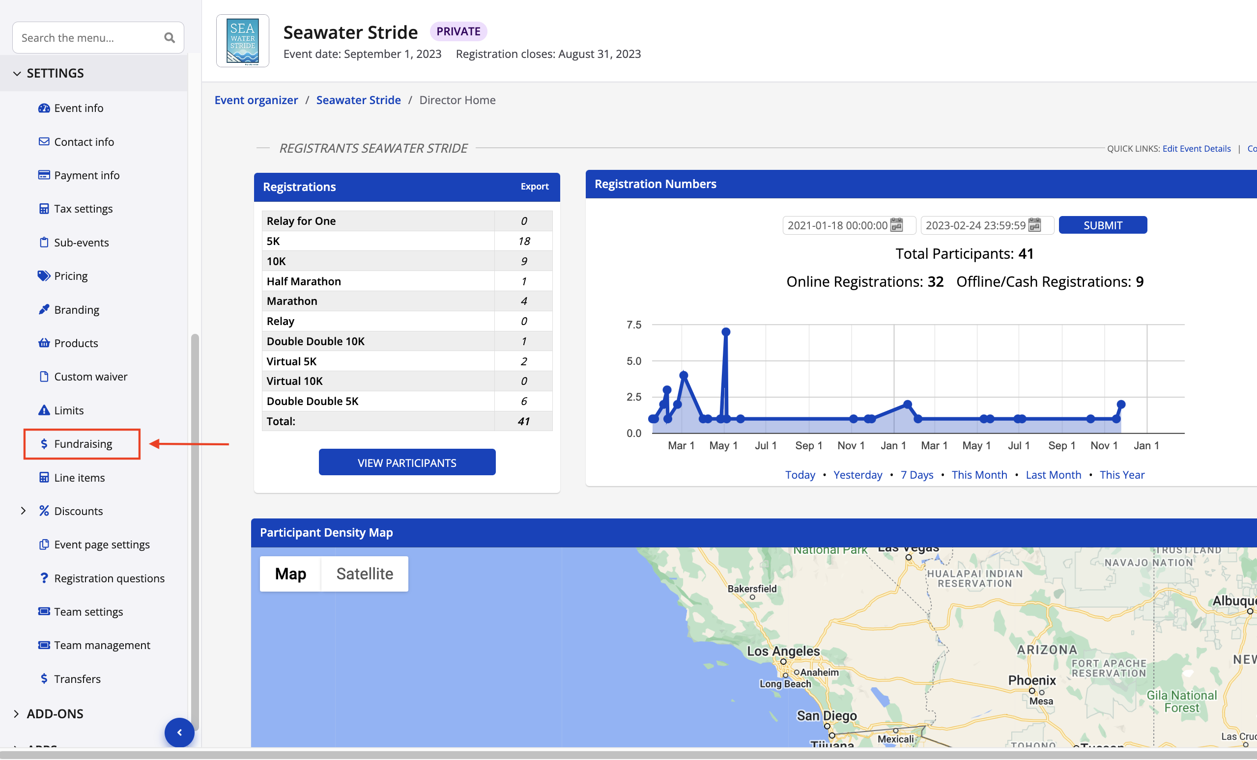 You will then land on the Fundraising overview page where you will be able to edit fundraising settings on an event level or organizational level.