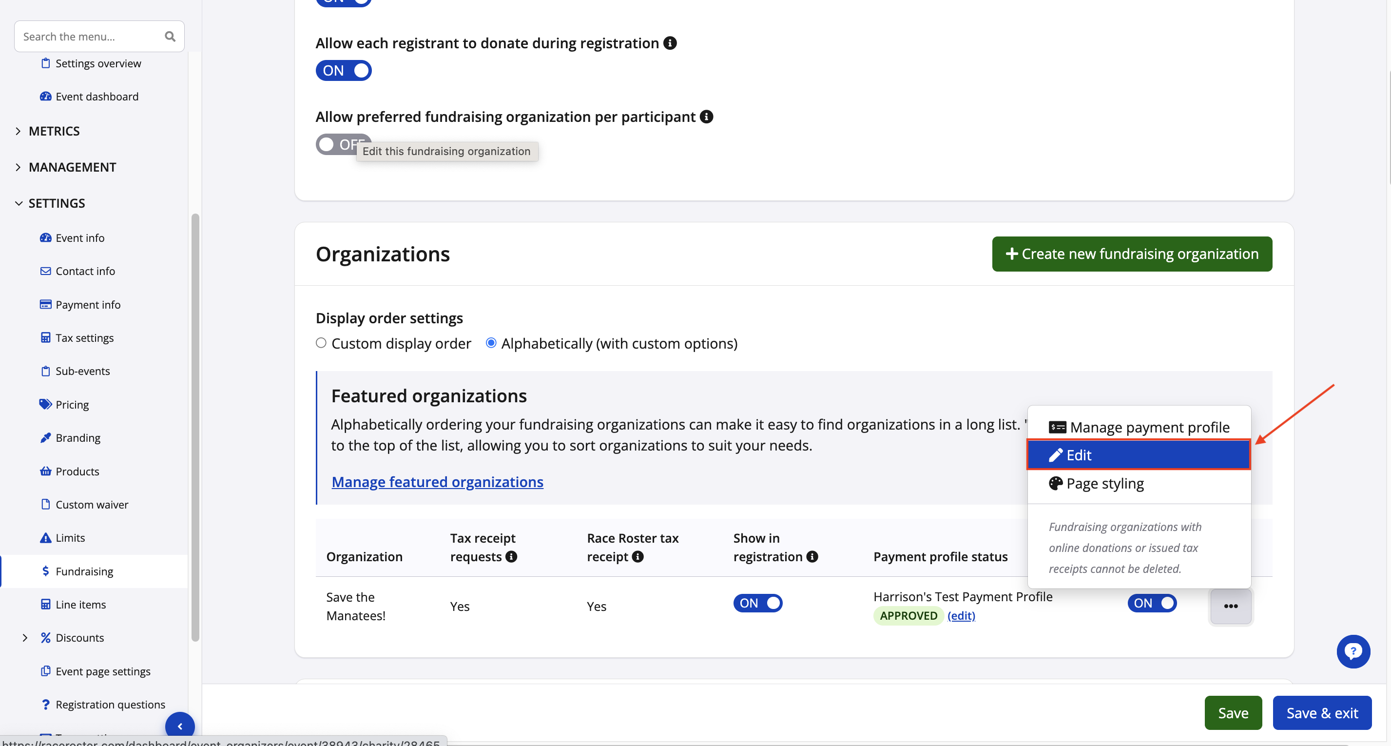 You will then land on the Fundraising organization settings page where you will be able to edit the organization.