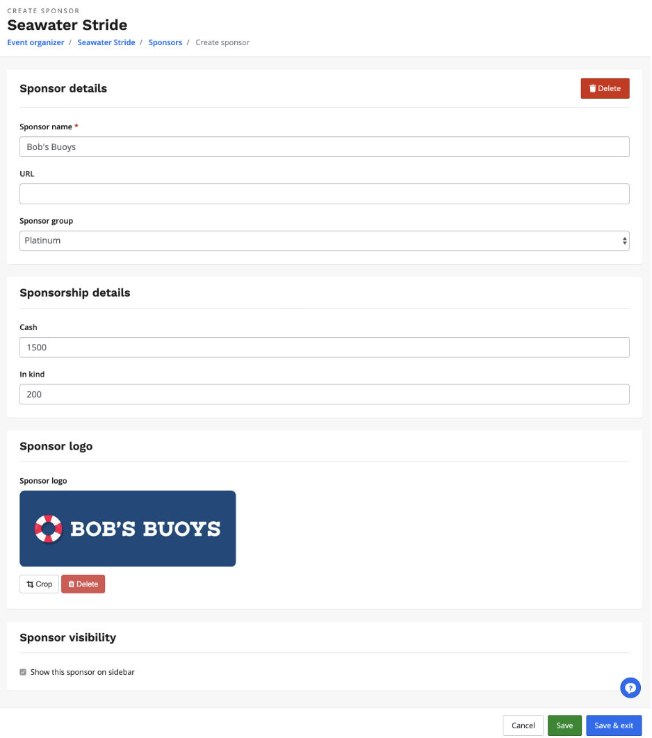 6. Once you're satisfied with the sponsor that you added, click Save or Save & Exit