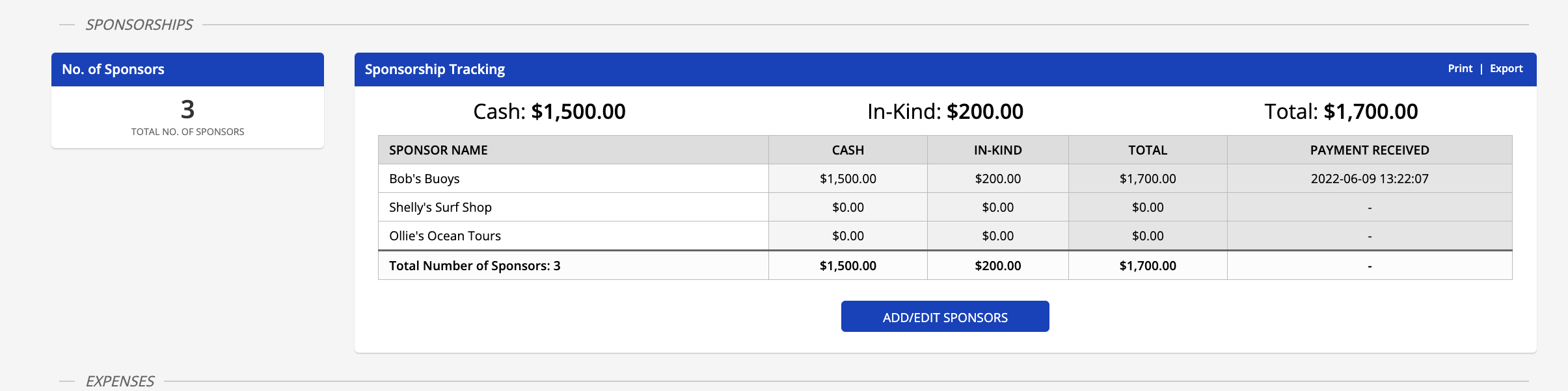 4. You will then be directed to the Sponsors page where you can add, edit, and group sponsors.