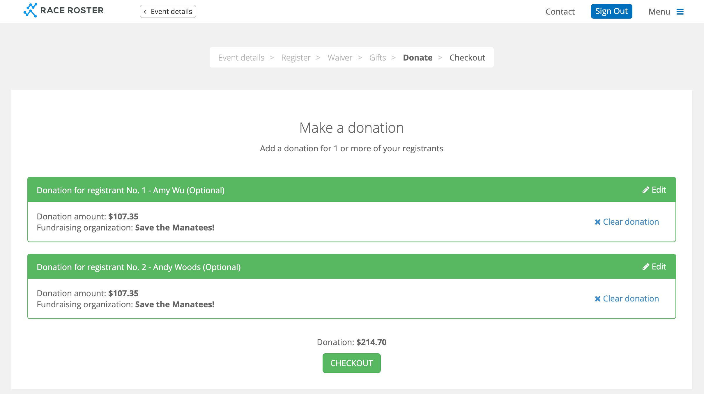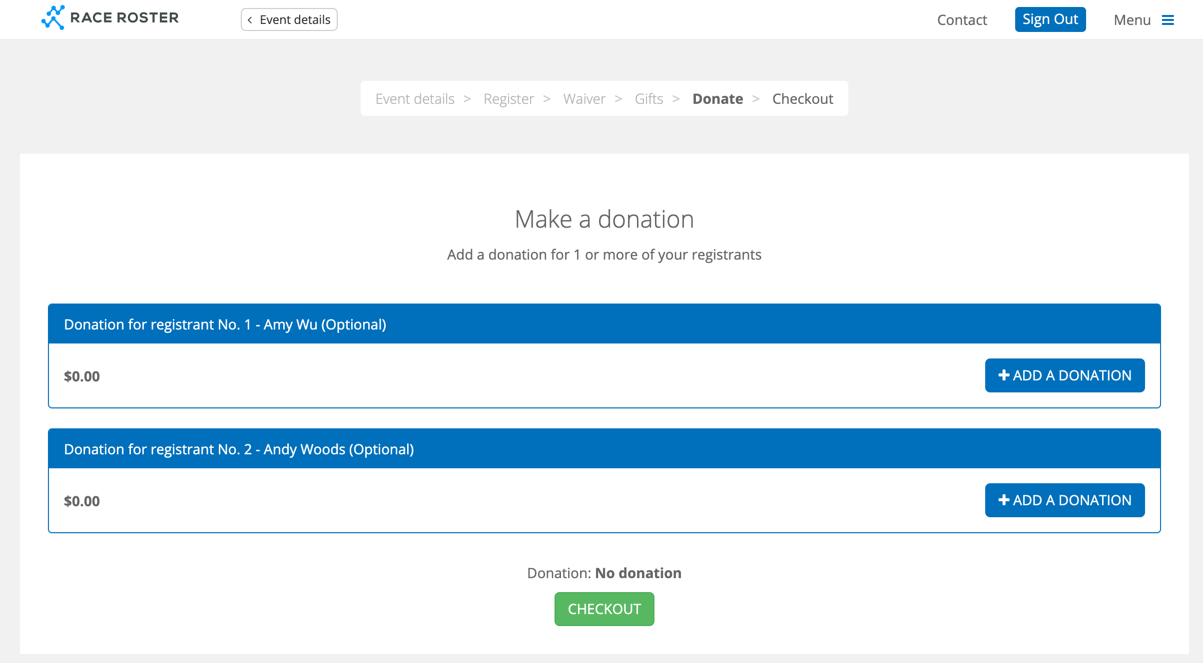 1. The user will be prompted to the donation page where they will see each registrant listed.