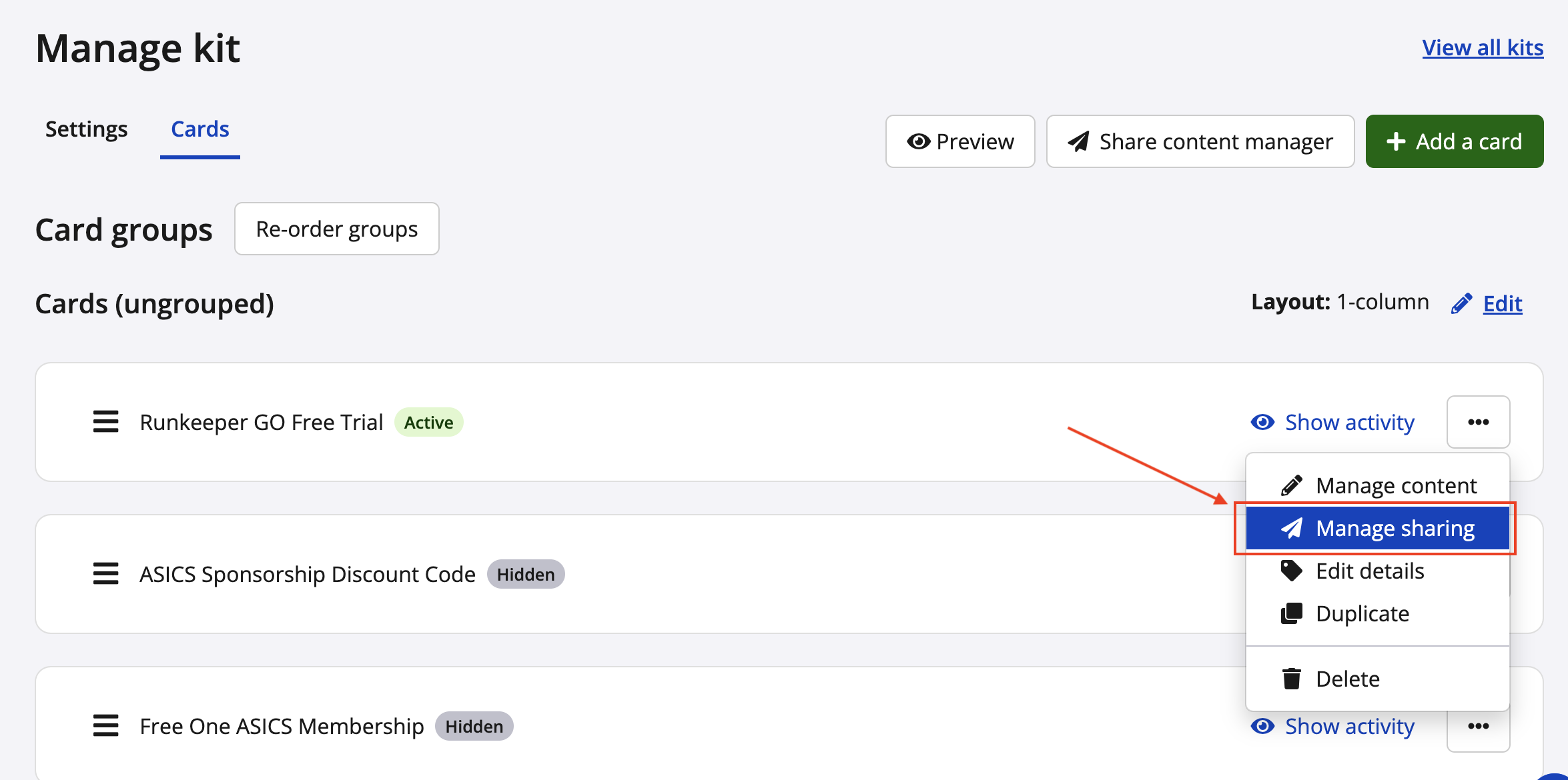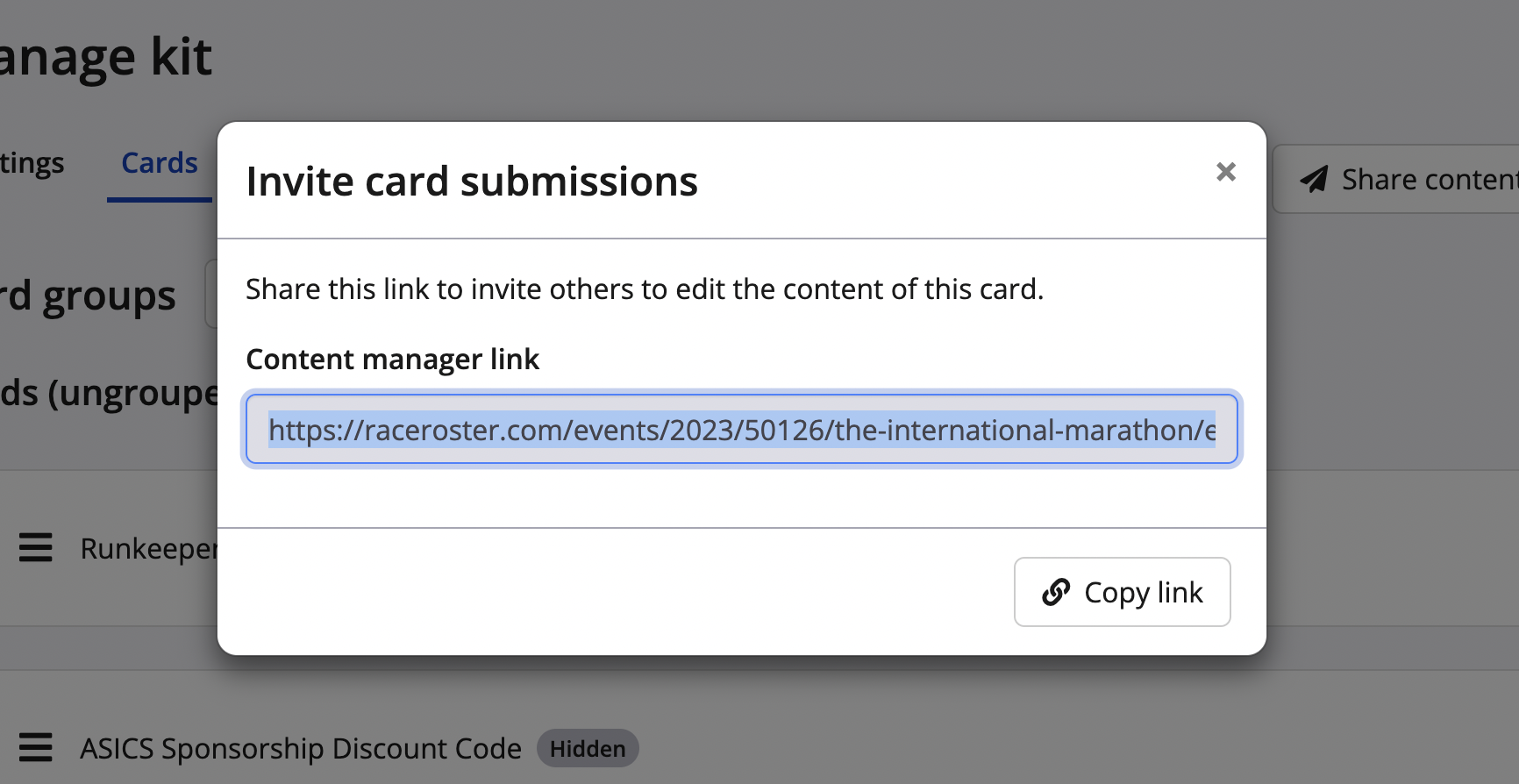 Select the kit that you'd like to give access for card submissions. At the top of the kit settings page, click on the share content manager button to find a unique link that can be shared with anyone who wishes to create a card for your existing kit.
