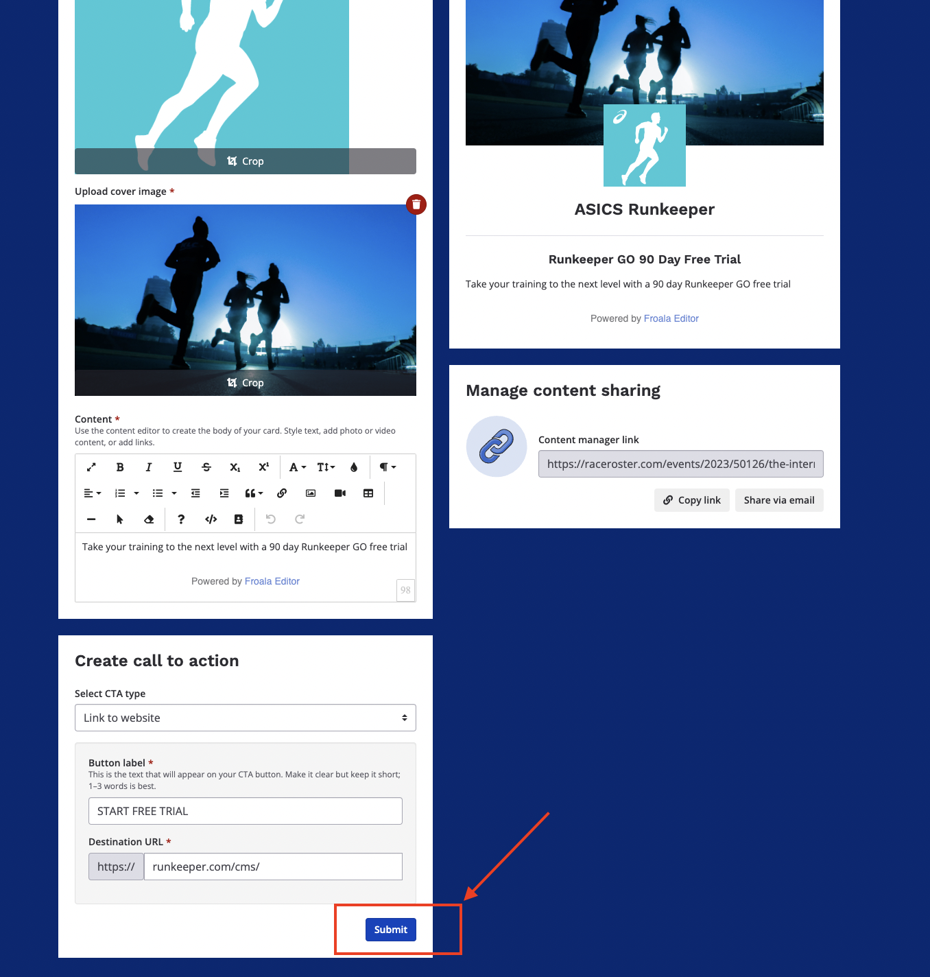 Once the individual has received the content manager link, they will be able to view the existing card and make any edits to the card's content. Once the user has finished making edits to the card, they will click the submit button to request approval for the submission (or it will be auto-approved if this permission was selected)