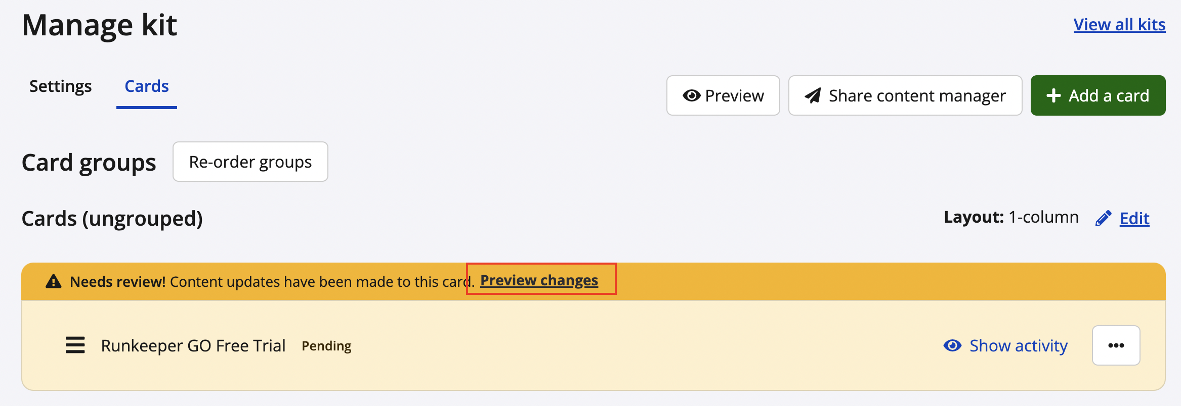 After submitting, the event organizer will be able to approve any edits made to this card from within their digital engagement kit/card settings as shown below. Click preview changes to either approve or reject the new edits on the card.