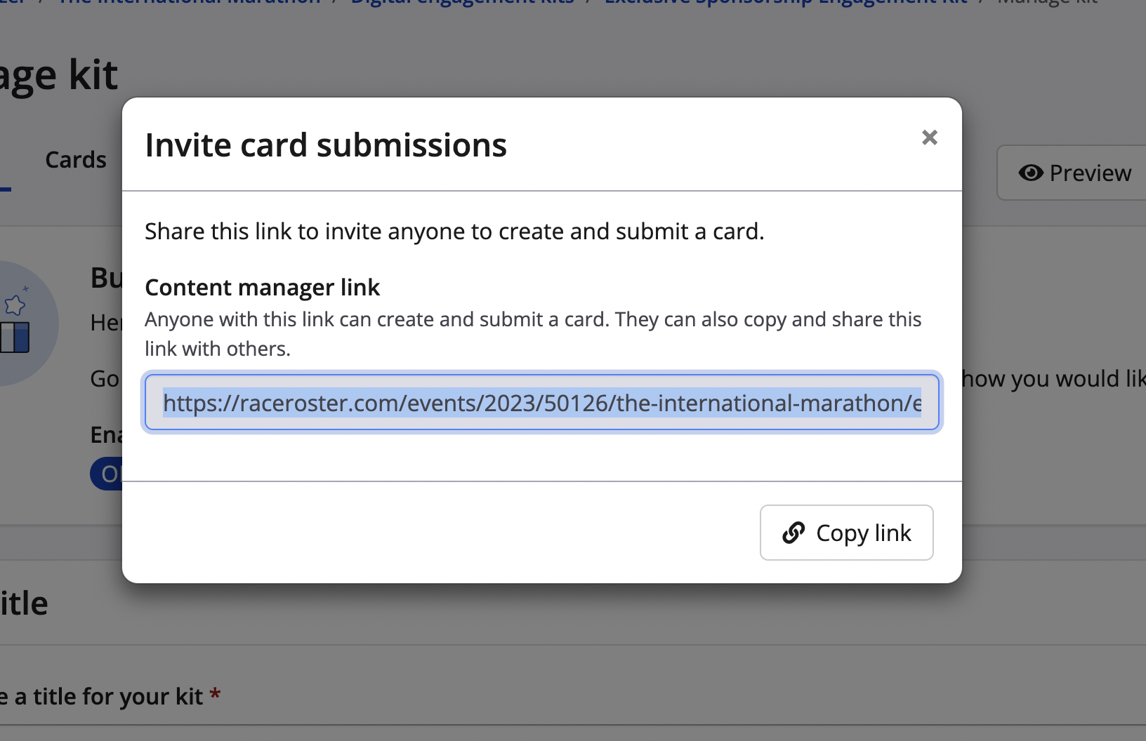 Digital engagement kits are a unique feature on Race Roster that allow for a variety of use-cases such as contest offerings, training plans leading up to the race, participant engagement, sponsorship offerings/discount codes, and many more (learn how to create digital engagement kits HERE). We have now added the ability for members of the public, sponsors, or anyone who is not event staff to submit cards to your existing digital engagement kits.