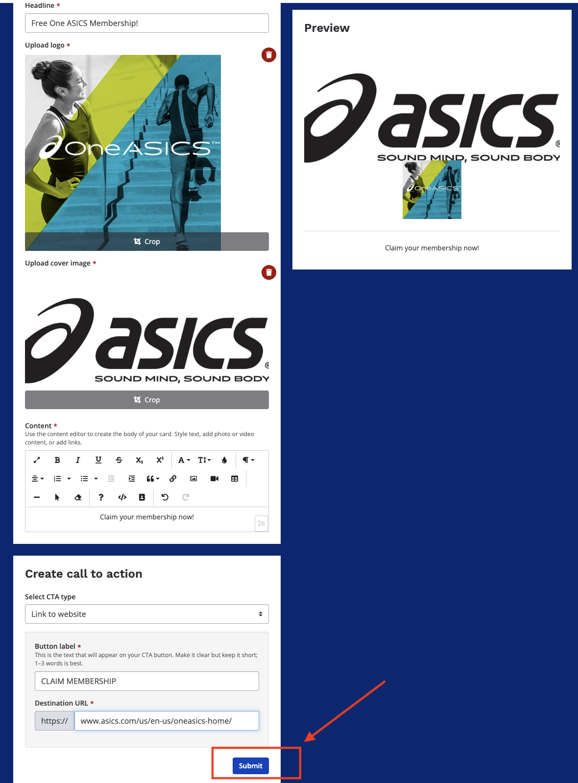 The user will now have access to create a brand new card from scratch in the exact same way that an event organizer creates a card from within the digital engagement kit settings. Users can add a logo, a cover image, custom text, a custom CTA, as well as any necessary links/files/promo codes. Once the user has finished creating their card, they can click the submit button to request approval for the submission (or it will be auto-approved if this permission was selected).