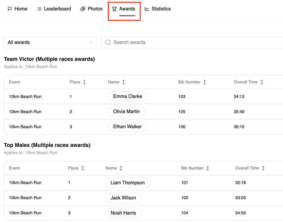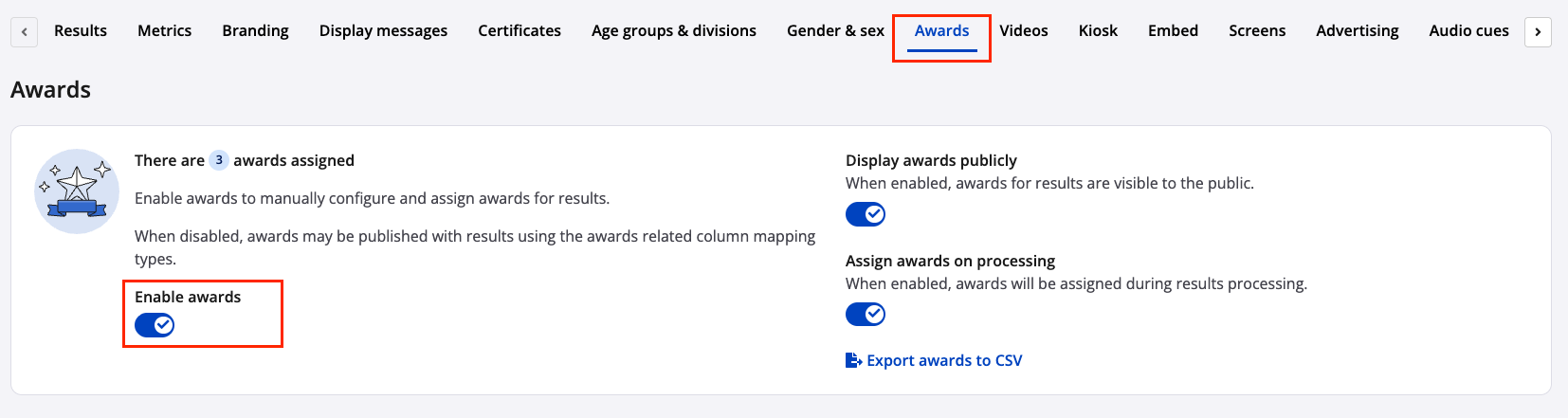 9. Once assigned, award winners will be visible on the results page.