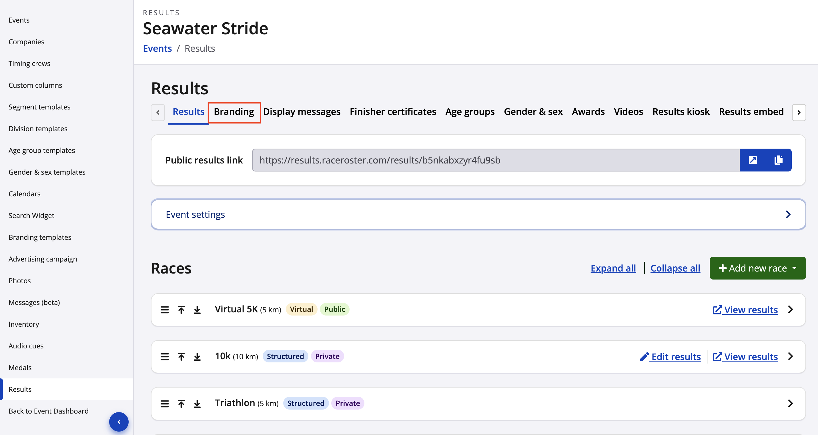 2. Once you have been redirected to the event's results admin, navigate to the Branding tab.