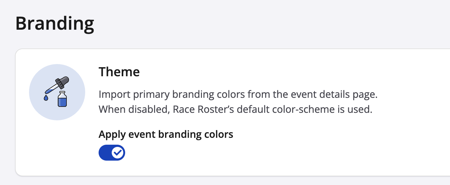 The theme toggle controls the colour scheme of your event's results page. This allows the user to select the branding colours used in the event's branding settings, or, use Race Roster's default colour theme. If the event's selected branding colours have high contrast that make text on your results page difficult to read, using Race Roster's default colour theme will offer a more accessible colour-theme offering a balanced contrast.