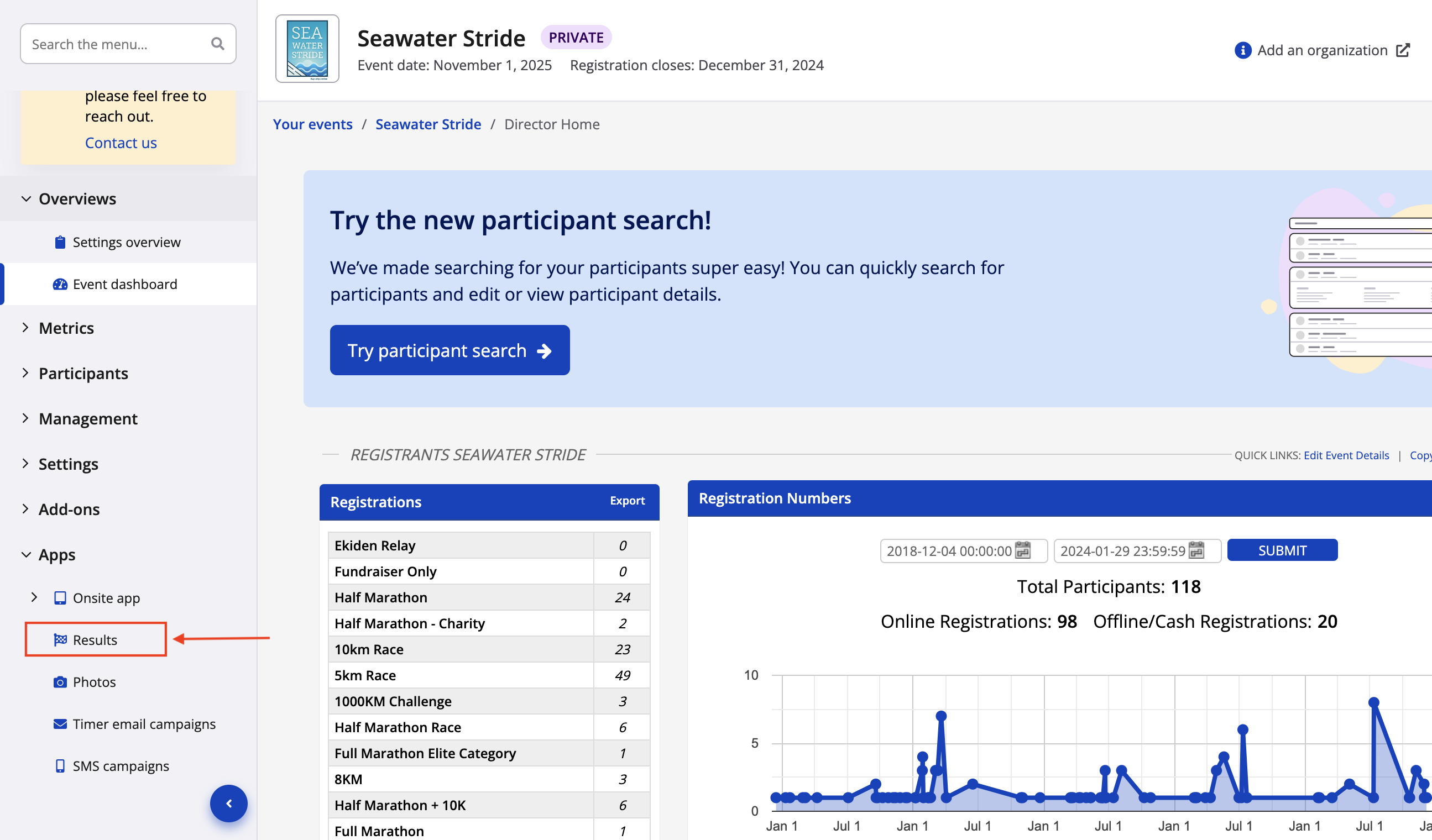 1. From your event dashboard, click on Apps -> Results from the lefthand side menu.