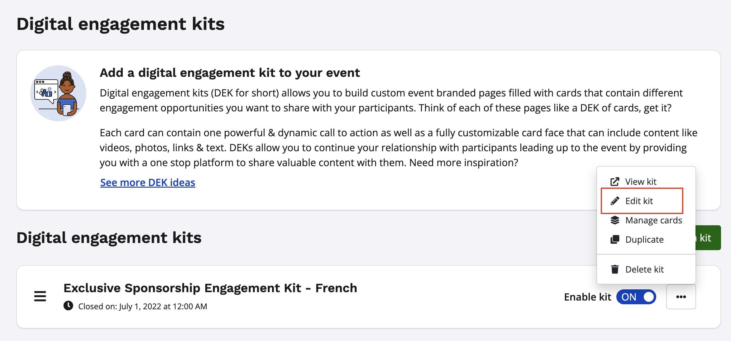 2. From your digital engagement kit settings, select the kit you'd like to change the default language for and click edit on it to go to your kit settings.