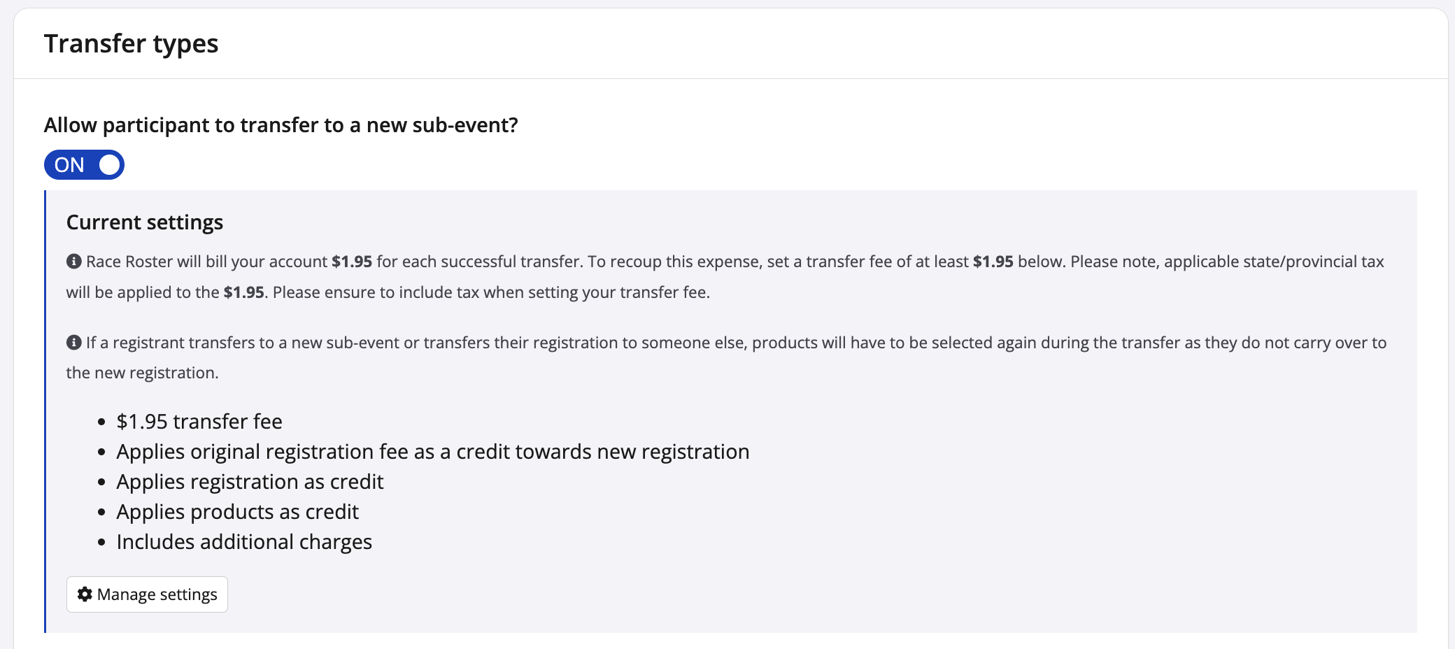 As an event organizer, tools are available to you on Race Roster to handle participant transfers on an automated basis. You may select settings according to your policies, and then make "Transfer" buttons and links visible on public-facing pages. This allows participants to handle transfers on their own and provide appropriate payment when applicable. Here are the steps for setup.
