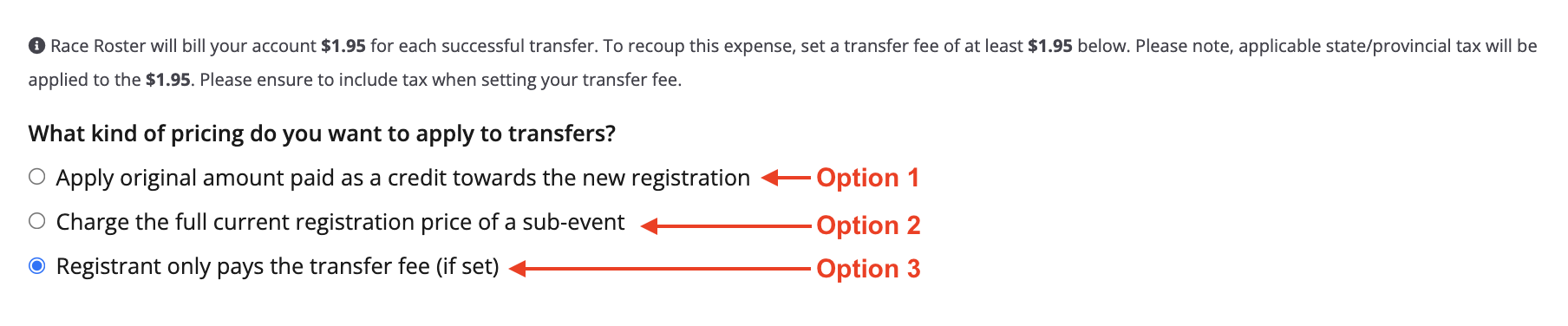 NOTE: Race Roster will bill your event's account a fee + applicable taxes for each successful transfer. To recoup this expense, set a transfer fee of at least that sum in the box provided. The fees in each currency follow: